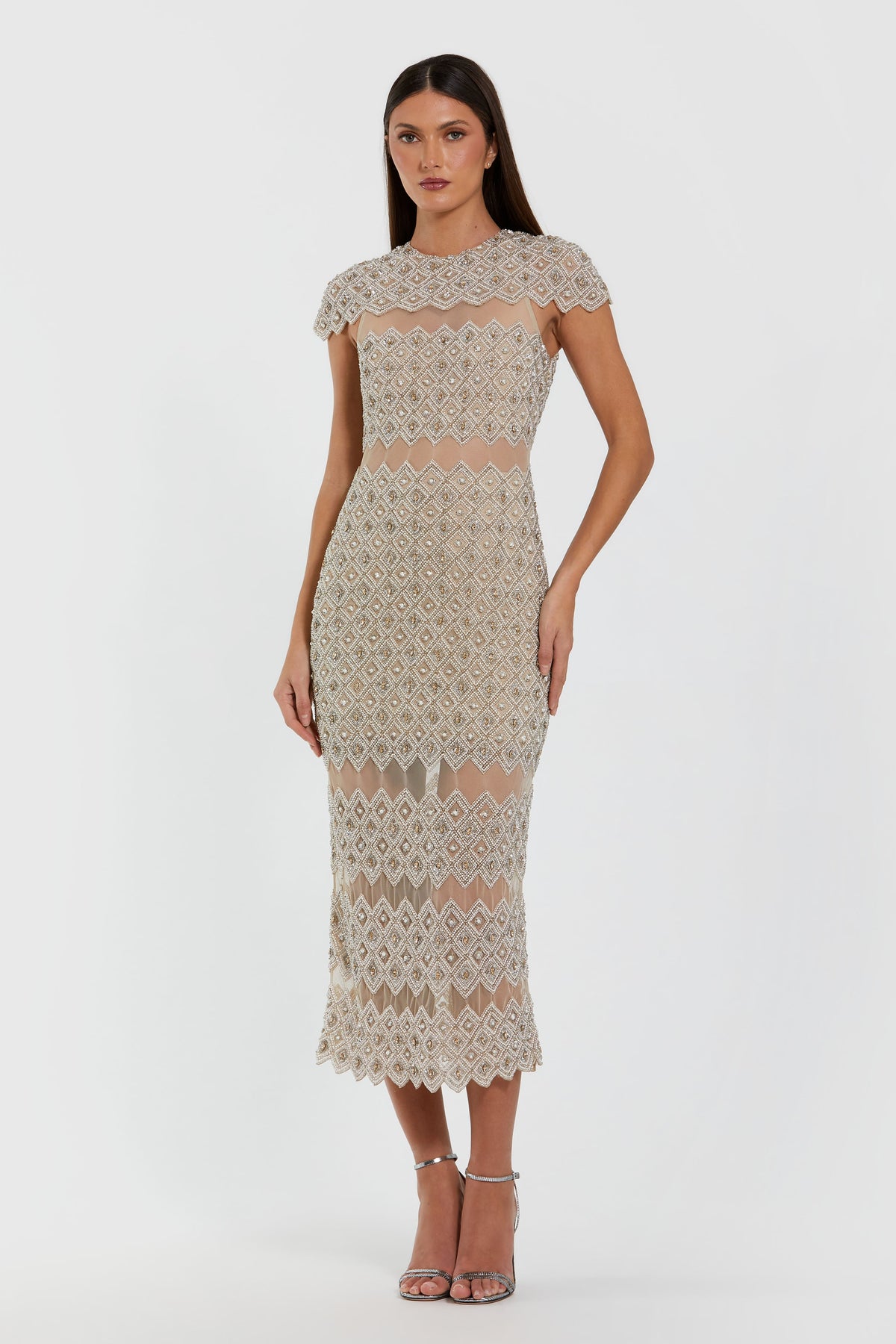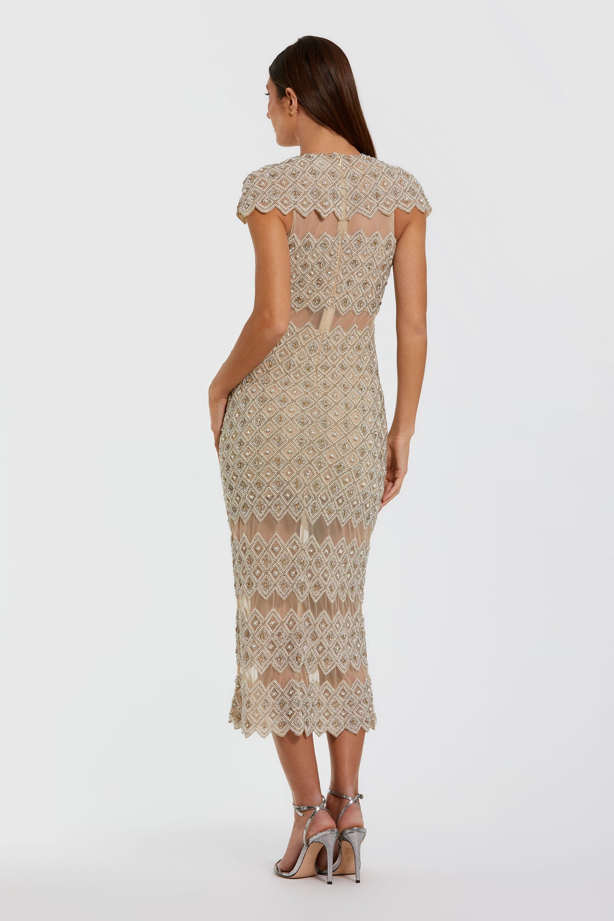 Step into a world of elegance with the Mac Duggal 10147 dress, a masterpiece crafted from exquisite lace and adorned with intricate beadwork. This stunning midi gown features a high neck and short sleeves, elegantly framing the silhouette while offering a refined touch. The sheath design hugs the body in all the right places, accentuating your form with grace. Perfect for formal events, cocktails, or galas, this dress is a celebration of sophistication, ensuring you shine with every step. The zipper back adds a modern twist to classic beauty, making it a must-have for the discerning fashionista.
