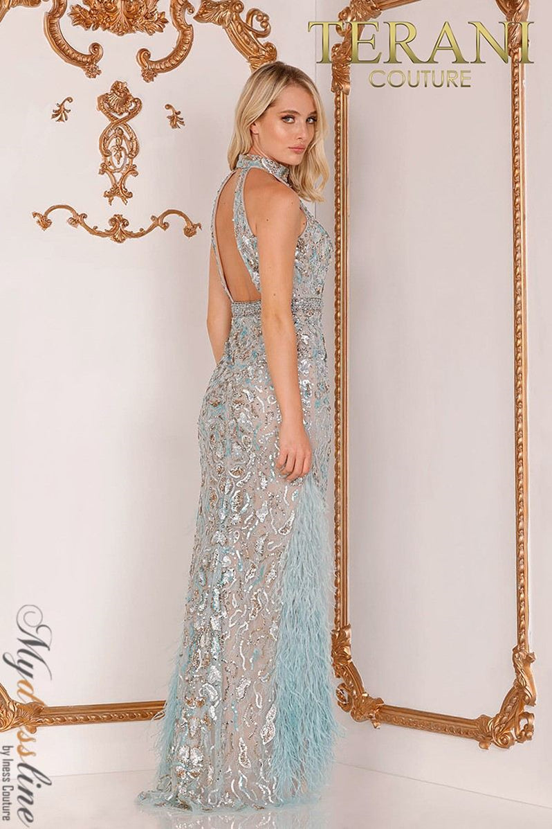 Elevate your evening with the Terani Couture 2027GL3246, a stunning long column dress crafted for moments that demand unparalleled elegance. This sleeveless masterpiece features a high neckline that exudes poised sophistication, while delicate feather accents and intricate beadwork shimmer with celestial grace. The fitted silhouette hugs your curves seamlessly, enhanced by a low zipper back that promises a flawless, tailored fit. Perfect for couture events, mother of the bride occasions, or any gala where you seek to captivate, this gown transforms you into the embodiment of refined glamour. Experience the art of exquisite craftsmanship and step confidently into the spotlight with Terani Couture.