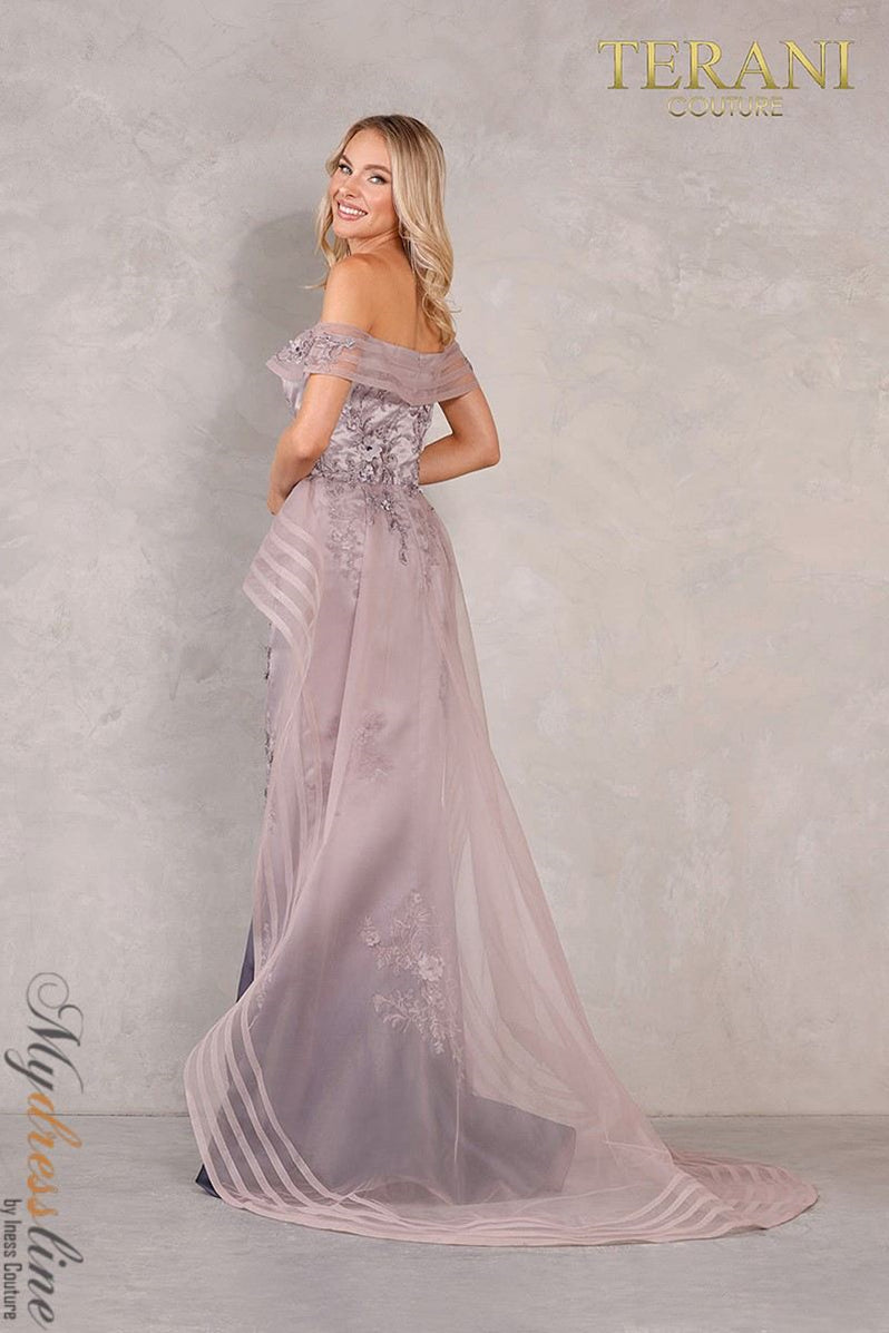 Step into refined elegance with the Terani Couture 2111E4746, a stunning evening gown designed to captivate from every angle. Crafted from sumptuous mikado fabric, this long, fitted column dress gracefully sculpts your silhouette, while the intricate embroidery adds a delicate, romantic texture that glimmers softly under ambient light. The strapless, off-the-shoulder neckline frames your décolletage with timeless sophistication, and the dramatic overskirt with a sweeping train creates a breathtaking movement as you enter the room. A discreet zipper at the back ensures a sleek, flawless fit, making this gown an impeccable choice for a mother of the bride or any distinguished evening affair, elevating your presence with effortless poise.