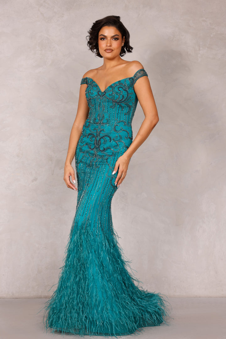 Step into the spotlight with the Terani Couture 2214GL0113, a stunning evening dress crafted for the most discerning occasions. This long, fitted mermaid gown showcases intricately beaded fabric that shimmers with every movement, enveloping you in a radiant glow. The sweetheart neckline and off-the-shoulder sleeves reveal a graceful décolletage, while the corset back enhances your silhouette with elegant precision. Feather accents add a delicate, enchanting touch, creating a harmonious blend of structure and softness. Whether attending a gala or celebrating as the mother of the bride, this exquisite design promises to elevate your presence with timeless sophistication and captivating allure.