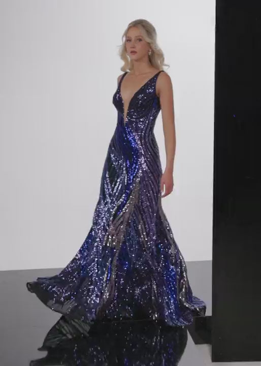 Experience the allure of the Jovani 05103, a stunning evening gown designed to elevate your most cherished moments. Crafted from shimmering sequin fabric, this mermaid silhouette gracefully contours your figure, exuding confidence and sophistication. The plunging V-neckline and delicate straps frame your décolletage, while the low back with a discreet zipper adds a seductive touch. Flowing into a dramatic trailing train, this long dress ensures you command attention with every step. Perfect for an unforgettable evening or as a distinguished mother of the bride dress, the Jovani 05103 combines impeccable craftsmanship with radiant elegance to make you the center of admiration.