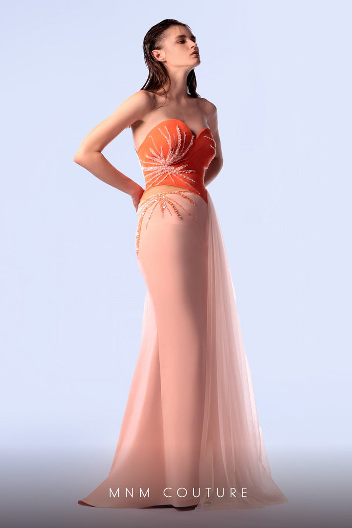 Elevate your presence with the MNM Couture G1717, a masterpiece from the Spring 2024 evening collection designed for moments that demand sophistication. Crafted from sumptuous crepe, this fitted, long dress drapes elegantly over your silhouette, enhancing your natural grace. The strapless sweetheart neckline frames your décolletage with timeless allure, while the subtle side skirt detail adds a whisper of movement and drama. Seamlessly secured by a discreet zipper at the back, this gown embodies effortless refinement. Perfect for couture events or as a distinguished mother of the bride dress, it promises to make you the epitome of elegance and confidence in any luxury setting.