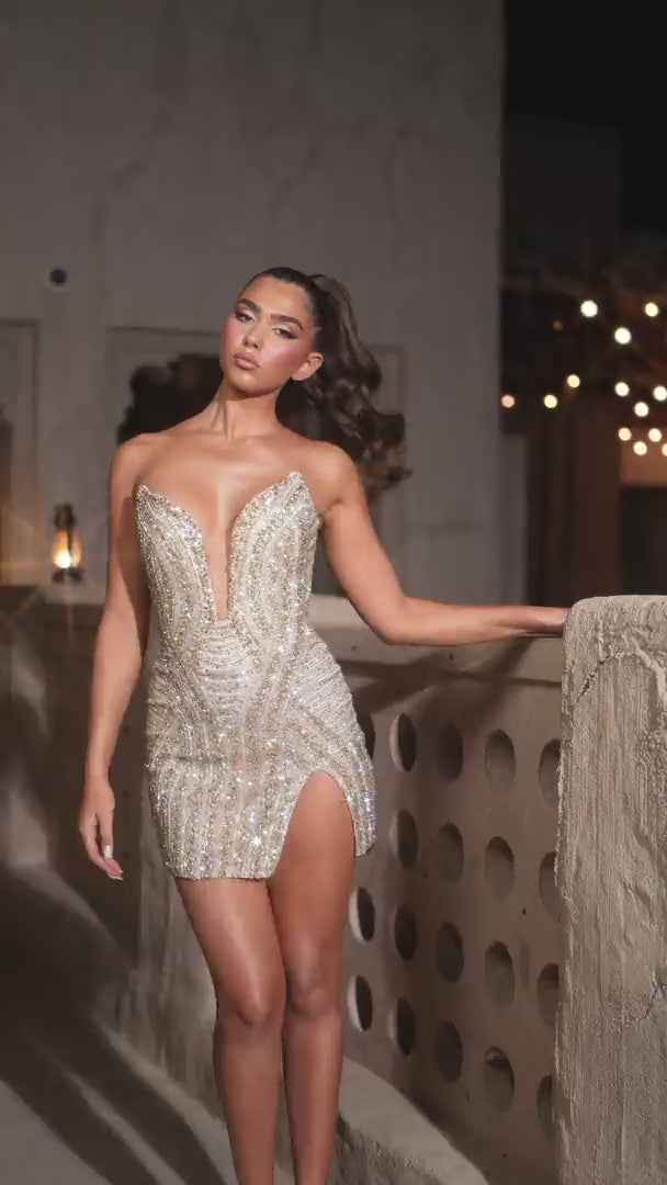 Step into the spotlight with the Portia & Scarlett PS25812C, a masterful blend of elegance and allure designed to elevate your cocktail experience. Crafted from intricately beaded fabric, this fitted, strapless dress contours your silhouette, enhancing every curve with a sophisticated sheen. The plunging V-neckline and daring slit offer a captivating balance of boldness and grace, while the sleek zipper back ensures a flawless fit. Ideal for those who demand refinement and presence, this short cocktail dress invites you to revel in moments of luxury and confident glamour at every celebration.