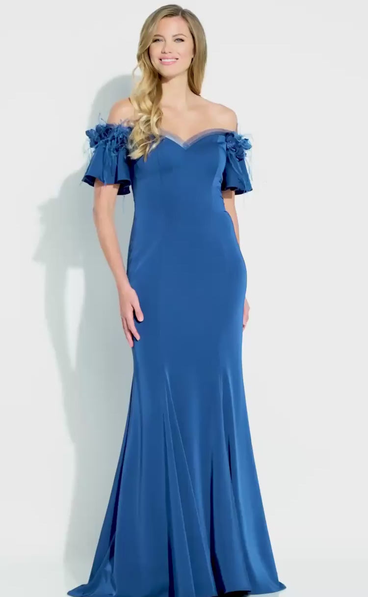 Step into an aura of refined elegance with the Cameron Blake CB146, a long evening dress meticulously crafted for those who command attention effortlessly. The soft crepe fabric drapes fluidly over your figure, enhancing your silhouette with its fitted mermaid style that celebrates your natural curves. A sweetheart neckline and delicate short sleeves frame you gracefully, while the dramatic train, adorned with ethereal feather detailing, adds a captivating flourish to every step you take. Designed with a discreet zipper back for ease and comfort, this gown transforms any special occasion into an unforgettable moment of glamour and poise. Let Cameron Blake elevate your presence with timeless sophistication and whispered luxury.