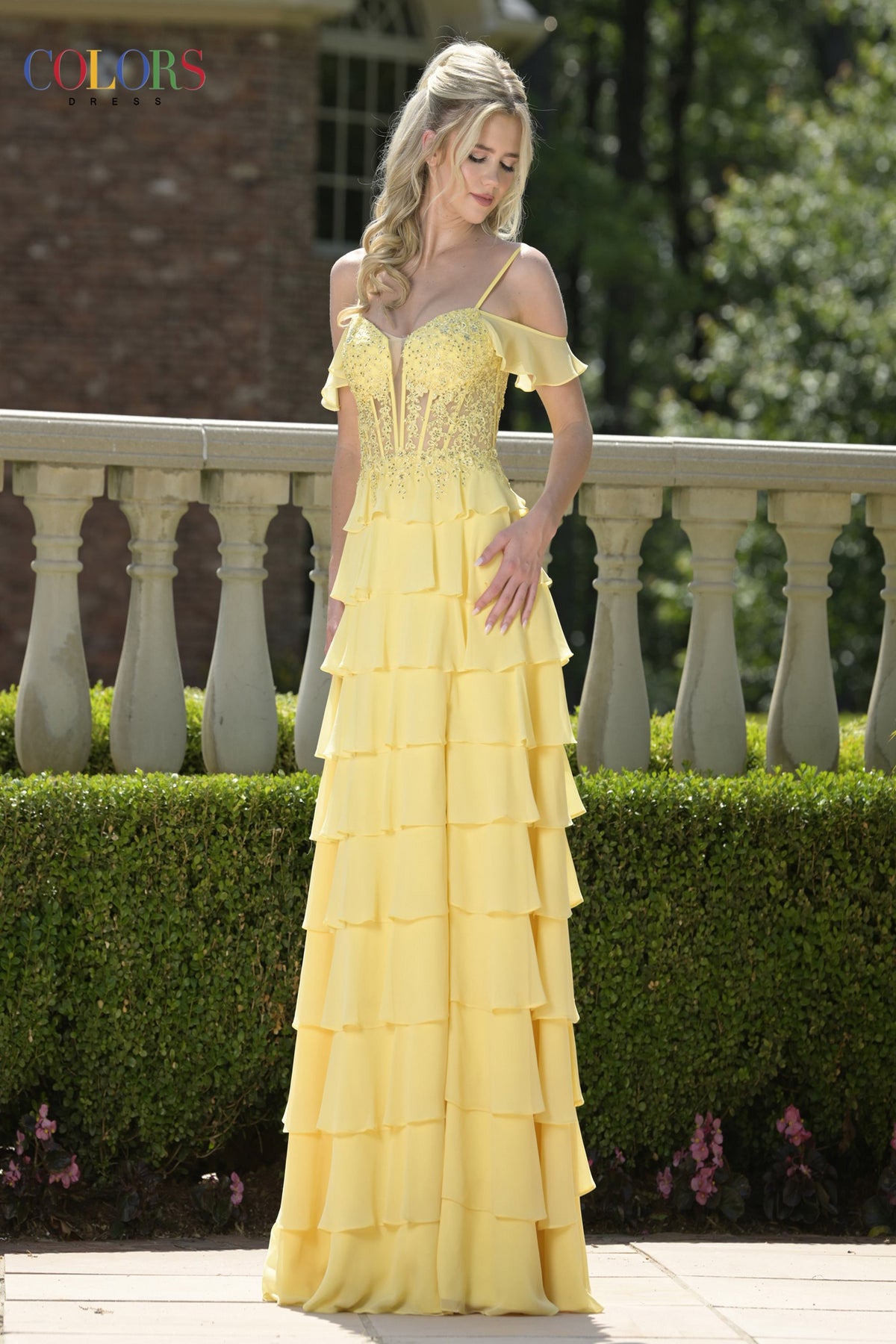 Step into the spotlight with the breathtaking Colors 3820 Evening Dress, designed for moments that matter. Crafted from luxurious chiffon, this A-Line silhouette drapes elegantly to create an ethereal flow with every movement. The sweetheart neckline highlights your décolletage while the off-the-shoulder sleeves add a romantic charm that’s perfect for any special occasion, from prom to mother-of-the-bride. Admire the intricate ruffles for a touch of whimsy, complemented by a corset lace-up back, ensuring a perfect fit that accentuates your figure. Embrace sophistication and grace with the Colors 3820, a true embodiment of elegance that you'll cherish forever.