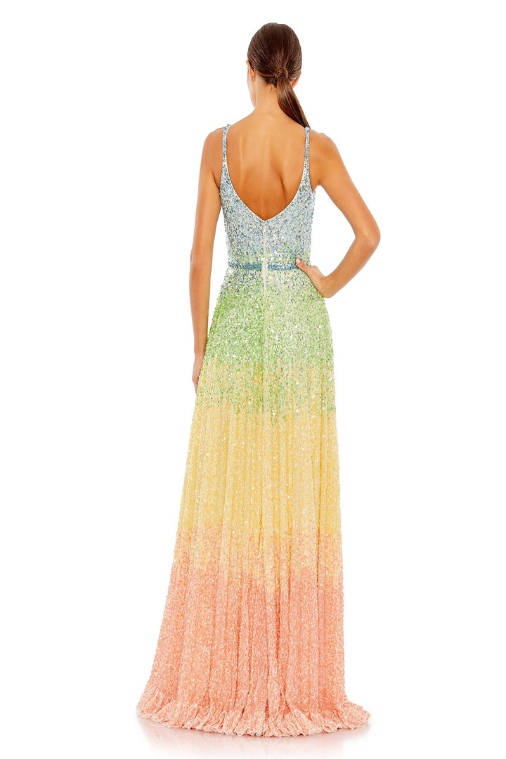 Step into an aura of sophistication with the Mac Duggal 5691, a mesmerizing A-line evening dress designed to elevate your presence at any gala or prom. This gown envelopes you in shimmering sequin fabric that catches the light with every movement, while its delicate spaghetti straps frame a graceful V-neckline, enhancing your silhouette with refined elegance. The true masterpiece lies in the dramatic ruffled cascade that flows from the waist down to the enchanting high-low hem, creating a dynamic and unforgettable look. Finished with a secure zipper back, this dress promises both comfort and poise, making you the undeniable center of attention.