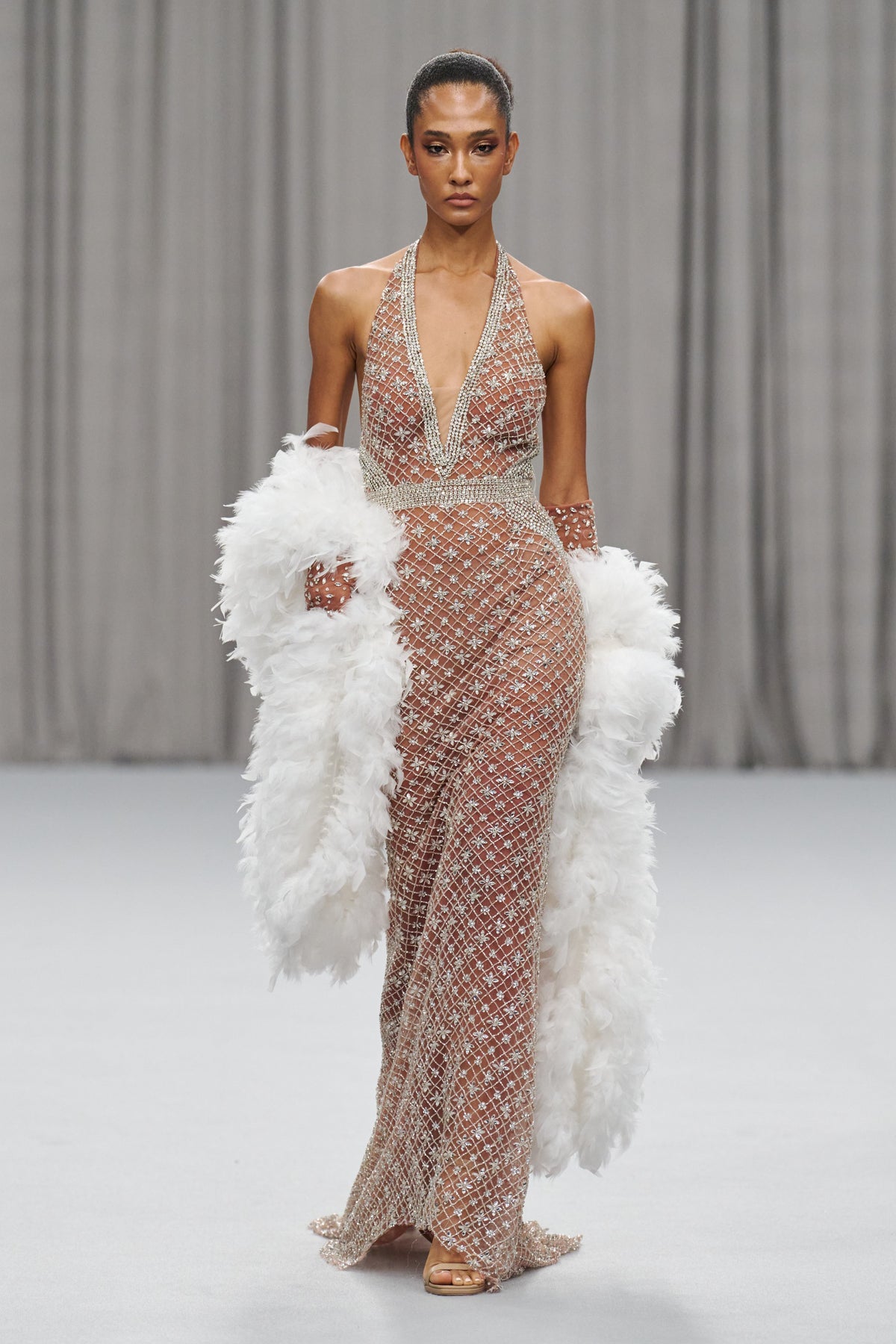 Elevate your evening with the Chic and Holland HF110561, a masterful blend of elegance and artistry designed for couture occasions. This fitted, long dress is adorned with intricate beading that catches the light exquisitely, creating a radiant shimmer as you move. The halter neckline frames your shoulders gracefully, while the sleeveless design adds a modern touch of sophistication. Delicate feathers enhance the flowing train, offering a captivating sense of movement and texture that sets you apart. The expertly crafted side zipper ensures a flawless fit, allowing you to embrace an unforgettable night with effortless style and confidence.