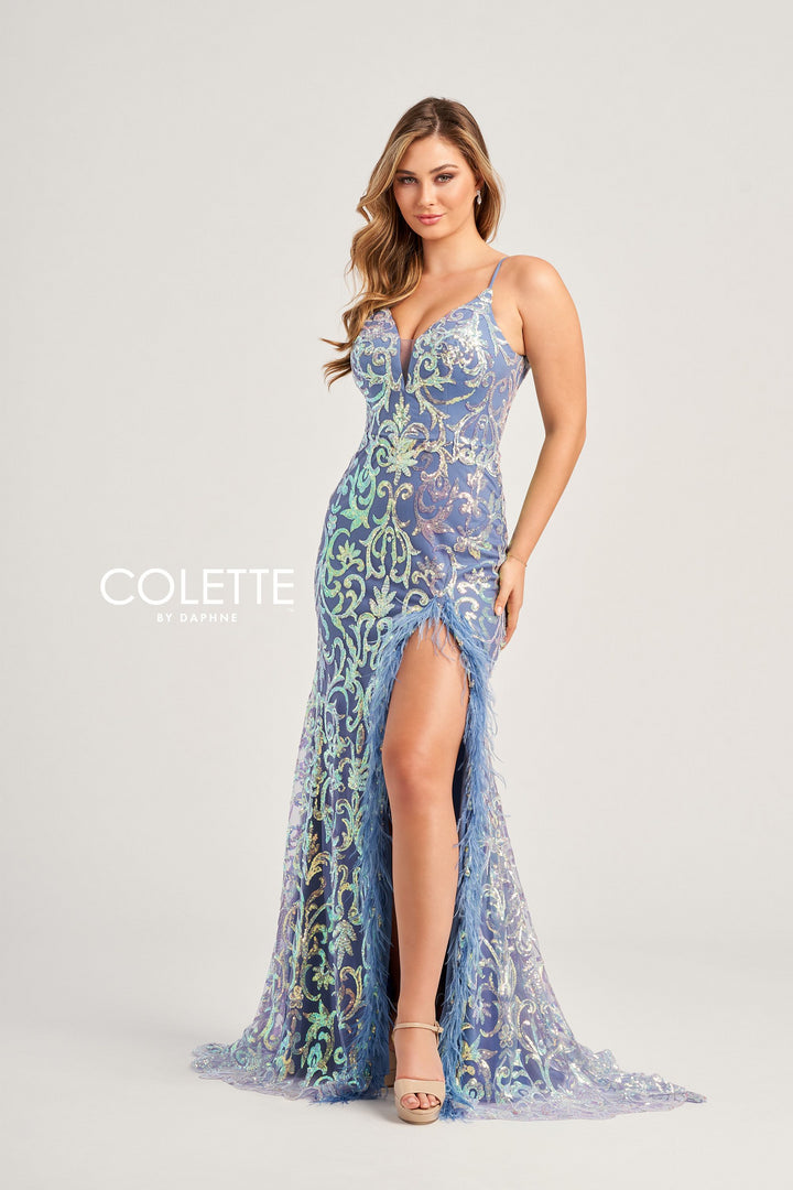 Step into a world of glamour with the Colette CL5155 by Andrea and Leo, a masterful evening gown designed to elevate your most unforgettable moments. Crafted from shimmering sequin fabric, this fitted long dress artfully embraces your silhouette, while a daring plunging neckline and strappy shoulders create an alluring frame. The low back adds a touch of sultry elegance, complemented by a dramatic high slit and delicate feather trim that softly sway with every step. Whether gracing a gala or prom night, the Colette CL5155 ensures you command attention with a captivating blend of sophistication and romance. Experience the dress that transforms you into the ultimate vision of enchantment.