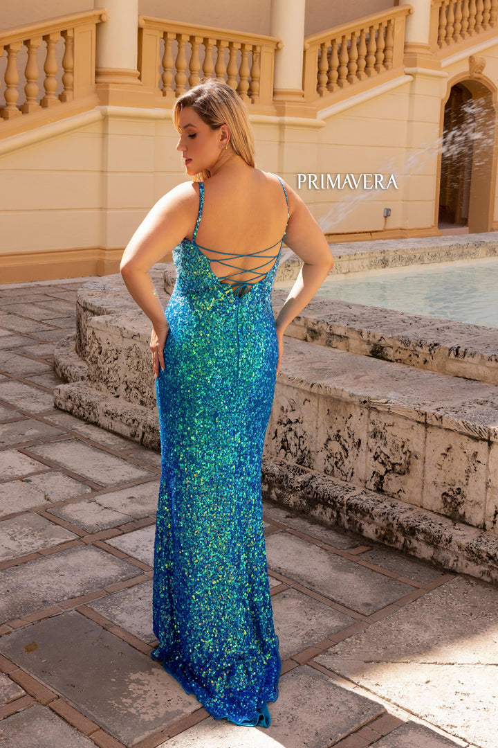Introducing the Primavera 14042, a stunning evening dress that redefines elegance and sophistication. Crafted from shimmering sequin material, this fitted masterpiece envelops your figure in luxurious radiance, drawing eyes with every step you take. The exquisite scoop neckline and delicate straps beautifully frame your silhouette, while the sultry slit adds a touch of allure, making it the perfect choice for any special occasion, be it prom night or an upscale gala. The corset lace-up back ensures an impeccable fit, allowing you to move confidently and gracefully throughout the evening. Imagine the soft shimmer cascading gracefully around you, embodying glamour as you dance the night away. Embrace the enchanting presence of the Primavera 14042 and let it elevate your wardrobe into a realm of timeless style and luxurious beauty.