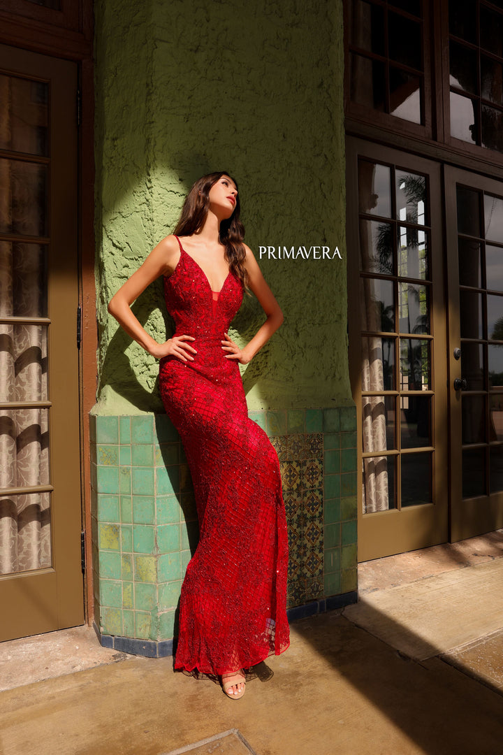 Elevate your evening allure with the Primavera 4113 gown, a masterpiece designed for those who desire sophistication and glamor. Crafted from luxurious beaded fabric, this fitted column dress gracefully hugs your silhouette, allowing you to flaunt your curves with confidence. The captivating V-neckline and elegant straps showcase your collarbone, while the daring slit adds a touch of audacity to your graceful stride. The low back enhances its allure, making it perfect for prom nights or glamorous soirées. Channel the elegance of high-profile red carpets with a design that promises to turn heads, leaving a lasting impression wherever your night takes you.