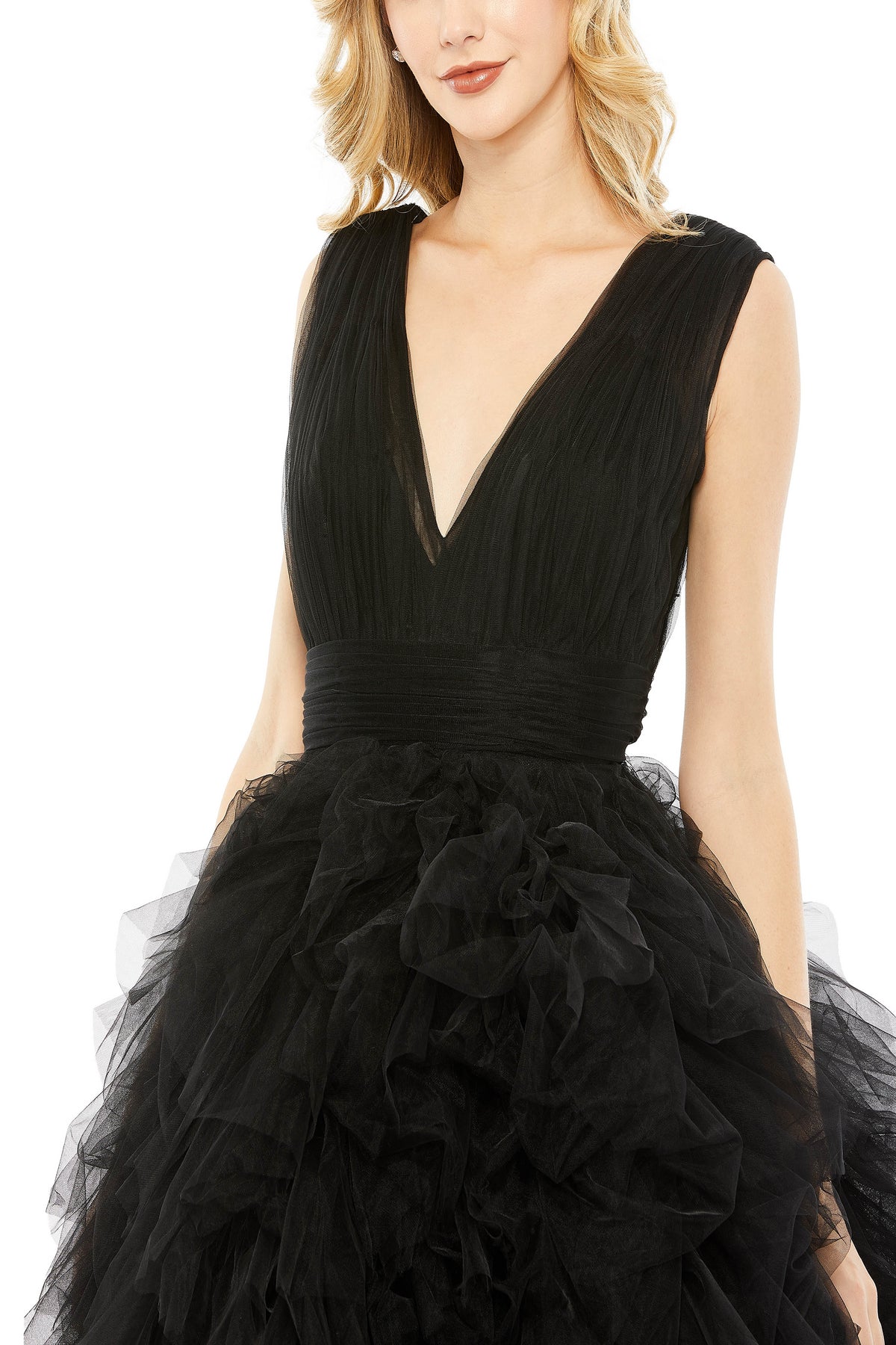 Step into an evening of unrivaled elegance with the Mac Duggal 20411, a luxurious tulle ball gown designed to elevate your special occasion wardrobe. This sleeveless dress features a bold plunging neckline that beautifully frames your silhouette, while the ruched, tiered skirt adds layers of delicate movement and captivating texture. With its tea-length hem, the dress balances sophistication and playful charm, allowing you to glide effortlessly through any event. Crafted with meticulous attention to detail and finished with a discreet zipper back, this gown promises both comfort and style. Experience the enchanting allure of Mac Duggal and command the room with every step you take.