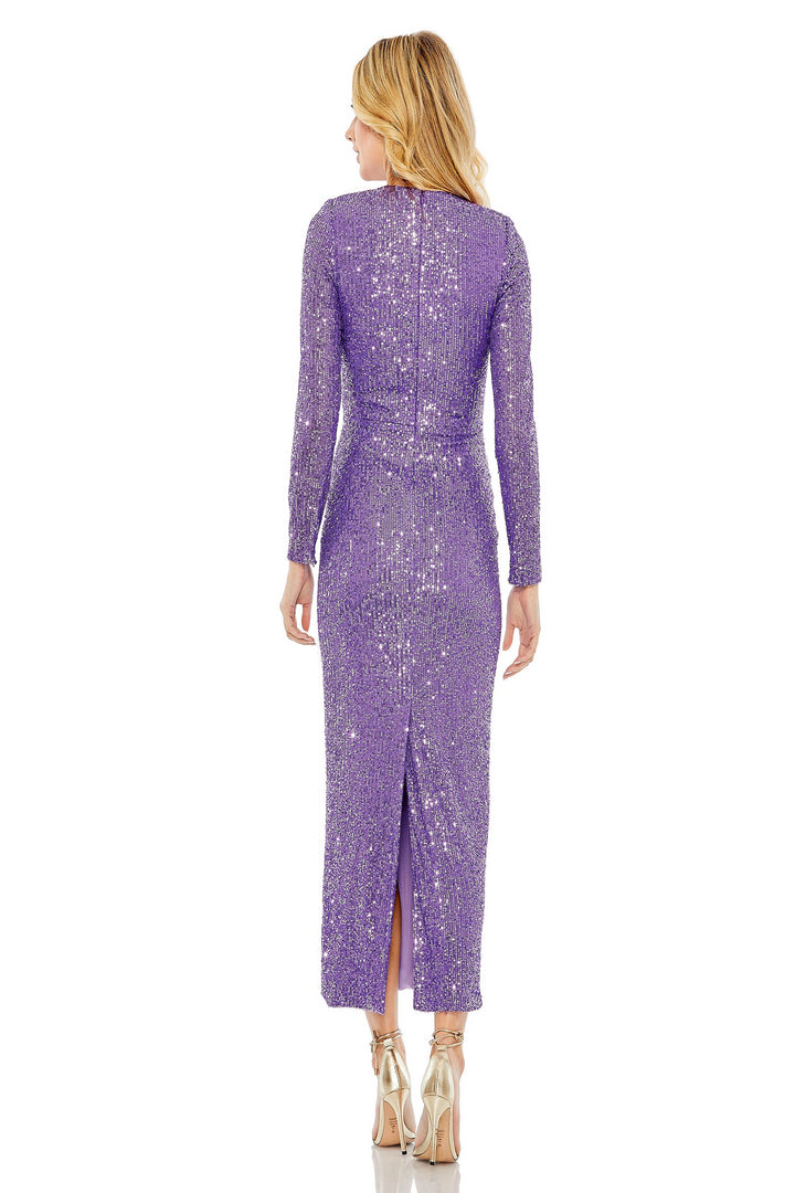 Step into the spotlight with the Mac Duggal 42043, a masterful evening dress designed to elevate your presence at any gala or special occasion. This tea-length column gown, crafted from shimmering sequin fabric, beautifully catches the light with every movement, enveloping you in a radiant glow. The fitted silhouette, enhanced by subtle ruching and a tasteful slit, accentuates your curves with effortless sophistication. A refined crew neckline and long sleeves balance allure with elegance, while the concealed back zipper ensures a flawless finish. Experience the perfect harmony of glamour and grace with this exquisite Mac Duggal creation that transforms every entrance into a statement.