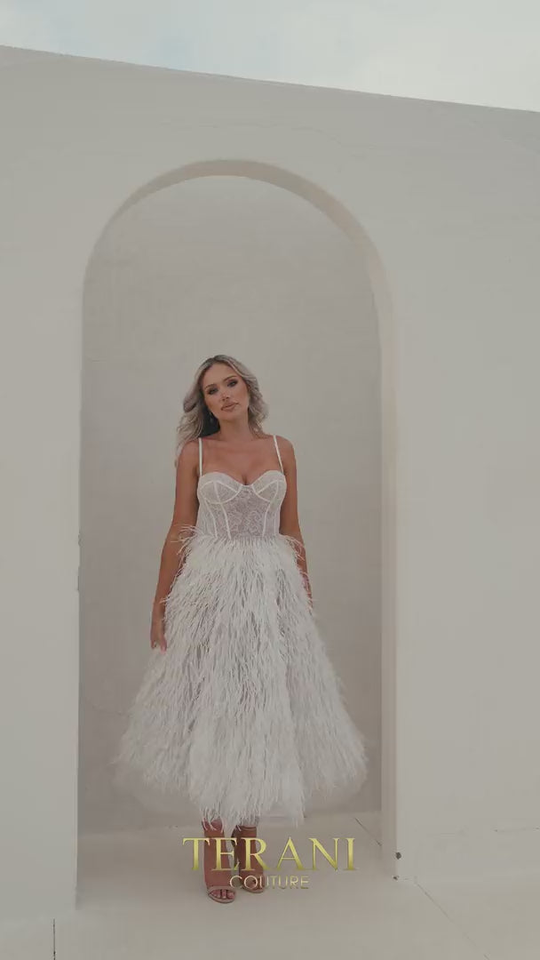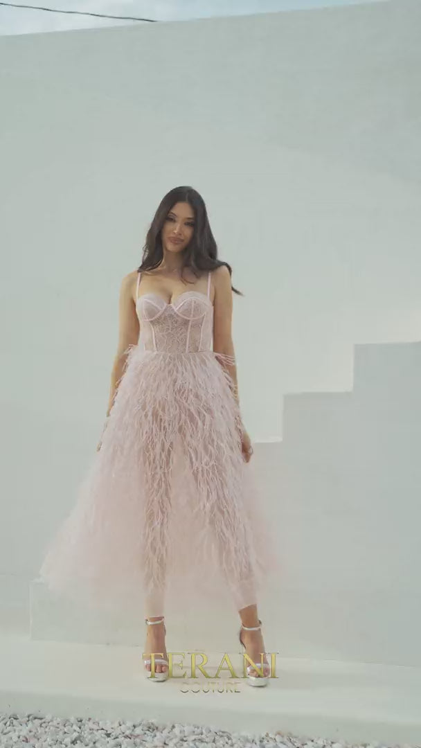 Step into refined elegance with the Terani Couture 241P2022, a tea-length A-line masterpiece designed to captivate at any cocktail affair. This enchanting creation features a delicate sweetheart neckline and slender straps that beautifully frame your shoulders, while the corset bodice sculpts your silhouette with impeccable precision. Crafted from ethereal tulle, its feather detailing adds an exquisite texture that evokes a sense of lightness and grace with every movement. The concealed zipper at the back ensures a flawless fit, allowing you to savor the seamless combination of comfort and sophistication. Elevate your presence and embrace the understated luxury of Terani Couture’s artistry.