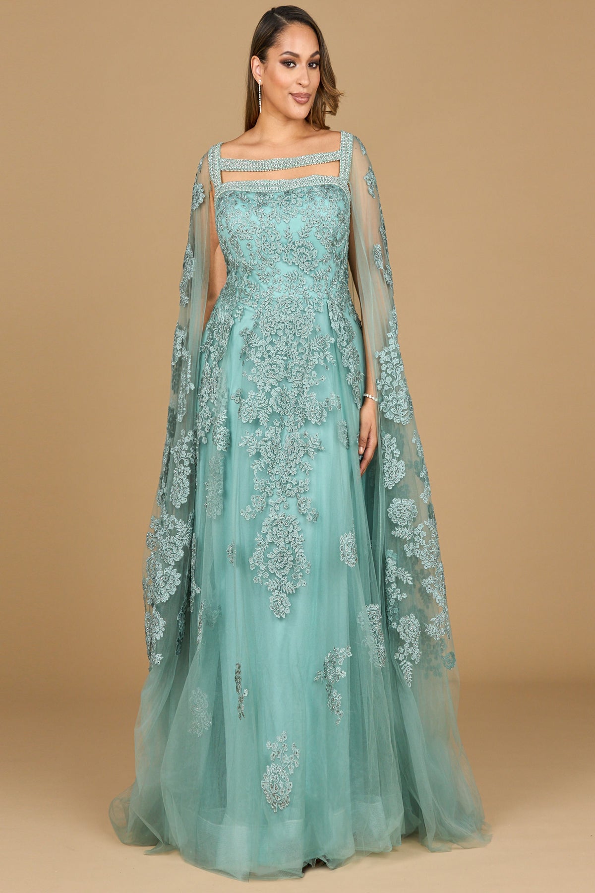 Step into the spotlight with the Lara 29138 by Andrea and Leo, a stunning long evening dress designed to celebrate your most cherished moments. Crafted from delicate tulle, this A-line silhouette gracefully skims your figure, while intricate embroidery adds an artful touch of sophistication. The distinctive square neckline and flowing cape sleeves create an ethereal presence, elevating your elegance with every movement. A discreet zipper at the back ensures a flawless fit, ideal for those seeking both comfort and glamour. Perfectly suited for mothers of the bride or any formal occasion, this luxurious gown invites you to embody timeless beauty and confidence.