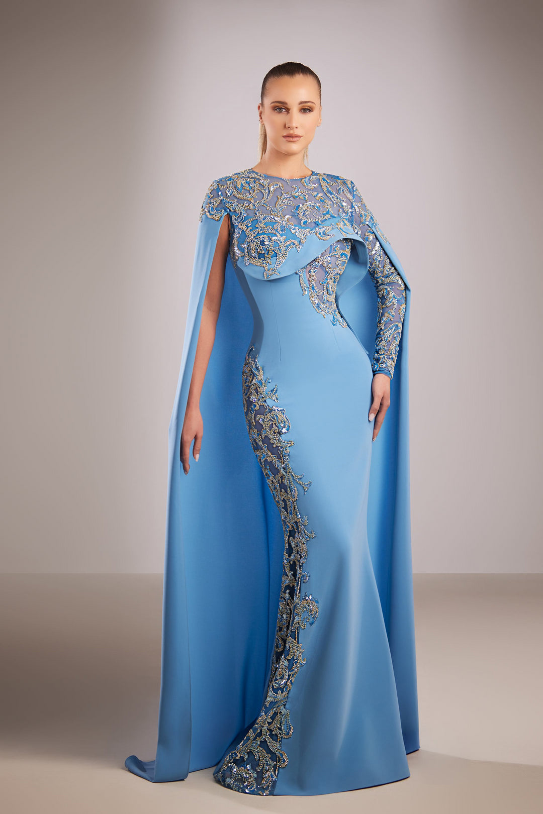 Sumérgete en una elegancia sin igual con el Reverie Couture FW199 de Reverie Couture, una mezcla magistral de arte y sofisticación. Este ajustado vestido de crepé azul abraza graciosamente tu silueta, mientras que el corpiño bordado en oro y plata deslumbra con intrincado trabajo de cuentas que captura la luz desde cada ángulo. Las mangas de capa completamente adornadas caen con un atractivo regio, añadiendo una dimensión dramática y etérea a tu presencia. Diseñado con un elegante cuello de tripulación y una discreta cremallera en la espalda, este largo vestido de noche presenta una cola fluida que llama la atención en cada paso. Ideal para eventos de alta costura o como un impresionante vestido de madre de la novia, promete elevar tu aspecto con lujo atemporal y artesanía impecable.