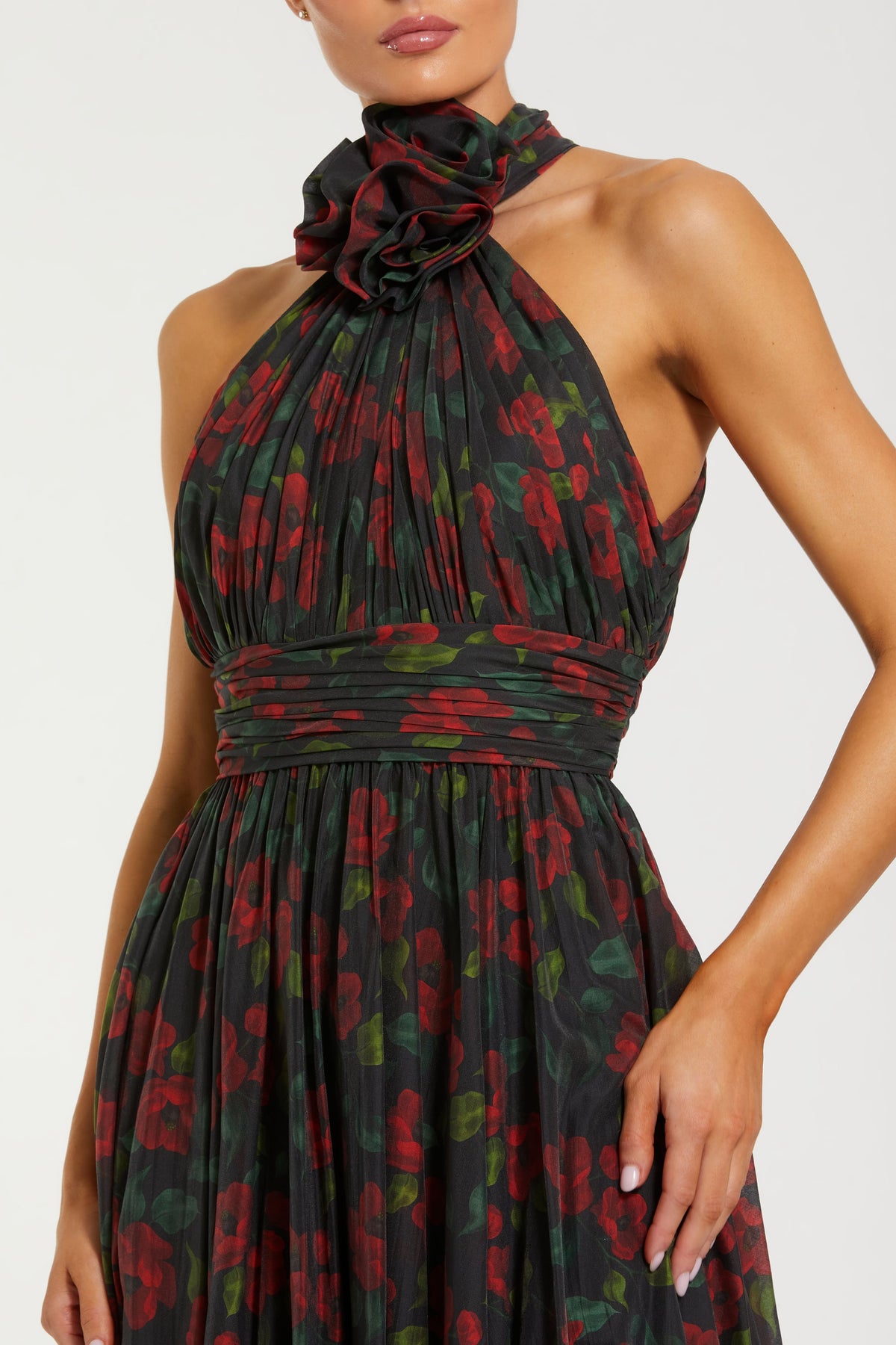 Adéntrese en un mundo de elegancia con el vestido Mac Duggal 27692, una obra maestra en lujoso chiffon y satén. Esta encantadora creación hasta el suelo presenta un cautivador escote halter adornado con delicados pliegues que enmarcan hermosamente el rostro. El diseño de espalda descubierta añade un toque de atractivo, mientras que la atrevida abertura invita a una mirada juguetona a la pierna al deslizarse por el suelo. El rico estampado floral danza en armonía con la suave tela, creando una silueta etérea que es a la vez sofisticada y encantadora. Perfecto para bailes de graduación, galas y veladas formales, este vestido asegura una entrada inolvidable.