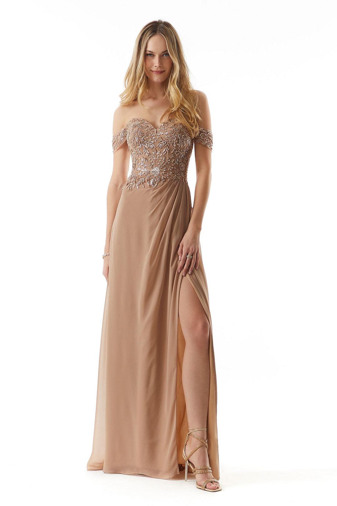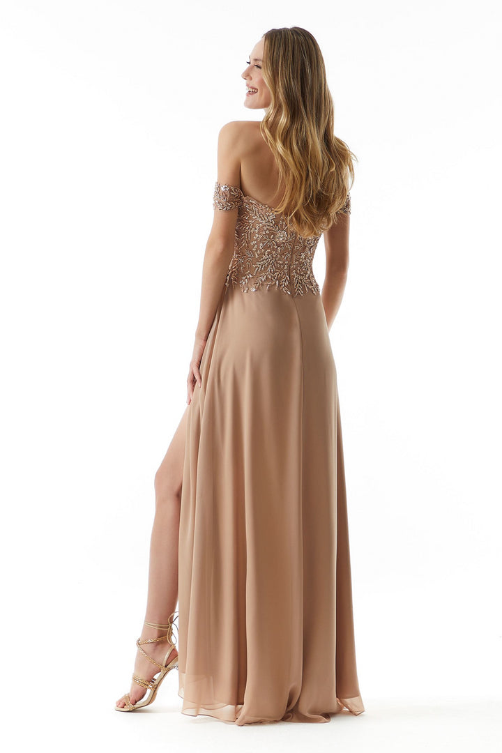 Experimenta la elegancia atemporal con el Morilee 73023, un impresionante vestido de línea A de gasa diseñado para hacerte sentir exquisitamente elegante. El delicado bordado de cuentas se desliza a lo largo de la tela drapeada, creando un efecto brillante que captura la luz con cada paso. Su escote corazón y silueta de hombros descubiertos enmarcan tus hombros con una allure refinada, mientras que la abertura sutil añade un toque de sofisticación moderna. Perfectamente confeccionado para eventos nocturnos o como un impecable vestido de madre de la novia, este vestido largo te envuelve en comodidad y estilo fluidos. Con una cremallera trasera segura y estola a juego, la artesanía de Morilee asegura que irradies confianza y lujo durante toda tu noche especial.