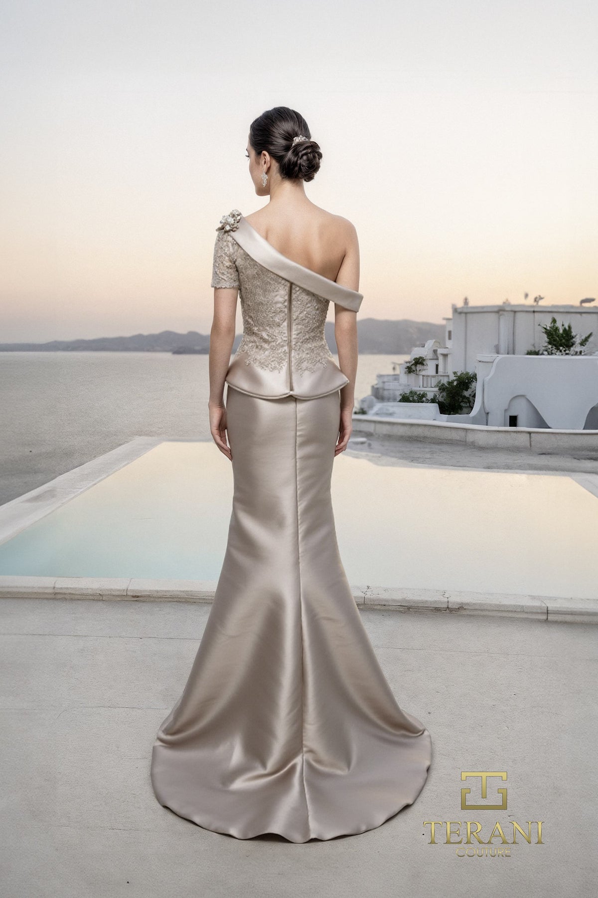 Elevate your formal wardrobe with 261M6408 Asymmetric Peplum Sheath Gown, a masterclass in refined sophistication. This long sheath design is crafted from luminous Mikado blended with delicate lace, creating a perfect balance of structure and femininity. Offered in elegant shades of mocha, navy, and wine, the gown showcases an asymmetric neckline that adds a modern edge, while the sculpted peplum accent at the waist defines and flatters the silhouette. The sleek sheath skirt extends 46" from the waist to hem, complemented by a graceful front slit for ease of movement and understated allure. A concealed center-back zipper with hook-and-eye closure ensures a flawless fit, while the sleeveless cut highlights the shoulders with confidence. Available in sizes 0–24, this gown is an ideal choice for mothers of the bride or groom who desire elegance with a contemporary twist.