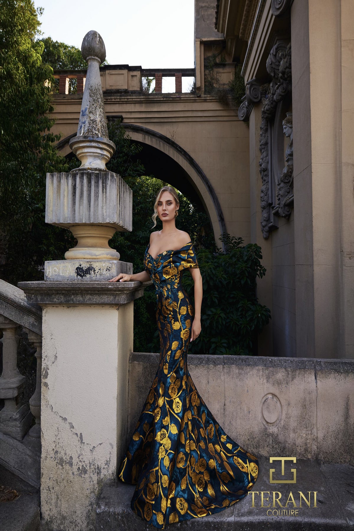 Step into pure sophistication with the Terani Couture 261E6273 evening gown, a captivating design that blends artistry with elegance. This off-the-shoulder mermaid silhouette sculpts the figure with precision, flaring into a dramatic sweep that enhances your every movement. Crafted from rich jacquard in an opulent teal and gold palette, the gown radiates luxury and modern refinement. The off-the-shoulder neckline highlights the décolletage, while the fitted bodice and flared hemline create a flawless balance of femininity and strength. A discreet center back zipper with hook-and-eye closure ensures a sleek finish from every angle. Measuring 46 inches from waist to hem, this gown is tailored for evening galas, black-tie affairs, or red-carpet moments. Perfect for the woman who wants to leave a lasting impression, this masterpiece is both timeless and fashion-forward.