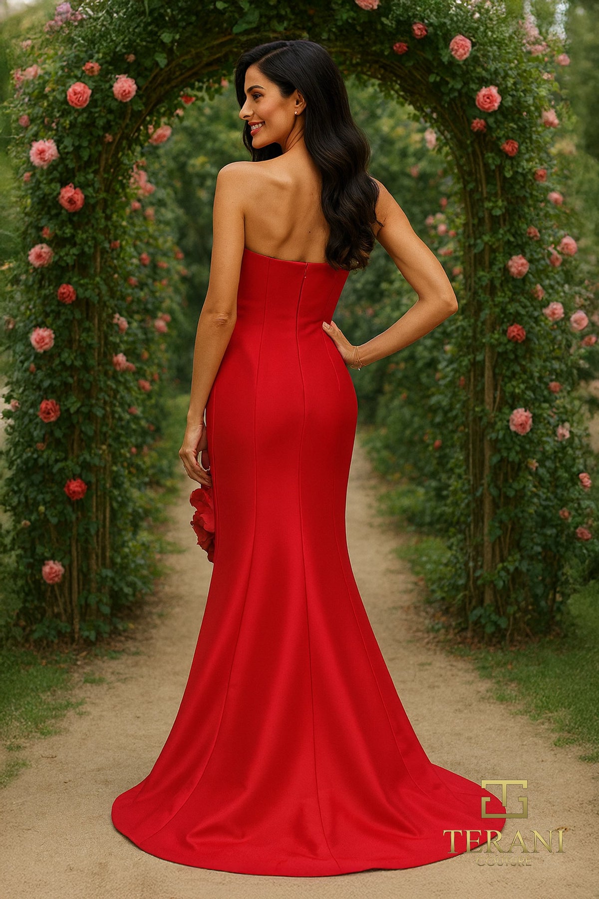 Elevate your evening look with the dramatic sophistication of 261E6698 Strapless Mermaid Gown. Designed in luxe stretch mikado, this gown molds beautifully to the body, delivering a flawless fit that highlights every curve. The straight strapless neckline is both modern and timeless, allowing the shoulders and collarbone to shine, while the sleek sleeveless design keeps the silhouette clean. A bold mermaid skirt flows from the fitted bodice, flaring elegantly to 46" from the waist to hem for a statuesque finish. Adding couture charm, oversized 3D floral appliqués cascade down the bodice and hip, drawing the eye with sculptural detail. Complete with a secure center-back zipper and hook-and-eye closure, this gown ensures effortless glamour from every angle. Available in blush, red, light blue, rose, ivory blush, and navy, it’s a stunning choice for galas, formal receptions, or black-tie occasions.