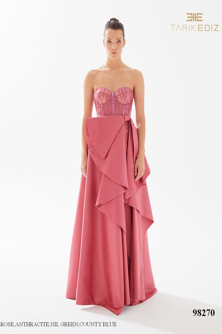 Experimente el epítome del glamour refinado con el Tarik Ediz 98270, un impresionante vestido de noche de línea A elaborado en tafetán suntuoso que acaricia graciosamente su silueta. El escote corazón y el diseño sin mangas invitan a un sentido de sofisticación sin esfuerzo, mientras que la espalda con cordones de corsé esculpe su figura con precisión, realzando sus curvas naturales. Los acentos artísticos de peplum, una abertura atrevida y un lazo delicado crean un encantador juego de texturas y movimiento, perfecto para hacer una entrada memorable en cualquier evento formal. Ya sea que esté asumiendo el papel de Madre de la Novia o asistiendo a una gala, este vestido largo promete una mezcla inolvidable de elegancia y atracción.