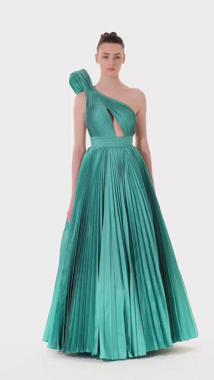 Eleve su guardarropa de noche con el Tarik Ediz 98272, un exquisito vestido de tafetán diseñado para cautivar. Esta silueta larga y en forma de A fluye graciosamente con cada paso, mientras que el corpiño plisado esculpe su figura con sofisticación refinada. El escote de un hombro y la correa asimétrica revelan una espalda baja cautivadora, fusionando el atractivo moderno con la elegancia atemporal. Diseñado para ocasiones memorables, el tejido ligero ofrece un brillo lujoso y un caída cómoda, asegurando que se sienta tan impresionante como luce. Abrace la confianza tranquila que este vestido transmite, atrayendo miradas y capturando admiración dondequiera que la noche la lleve.