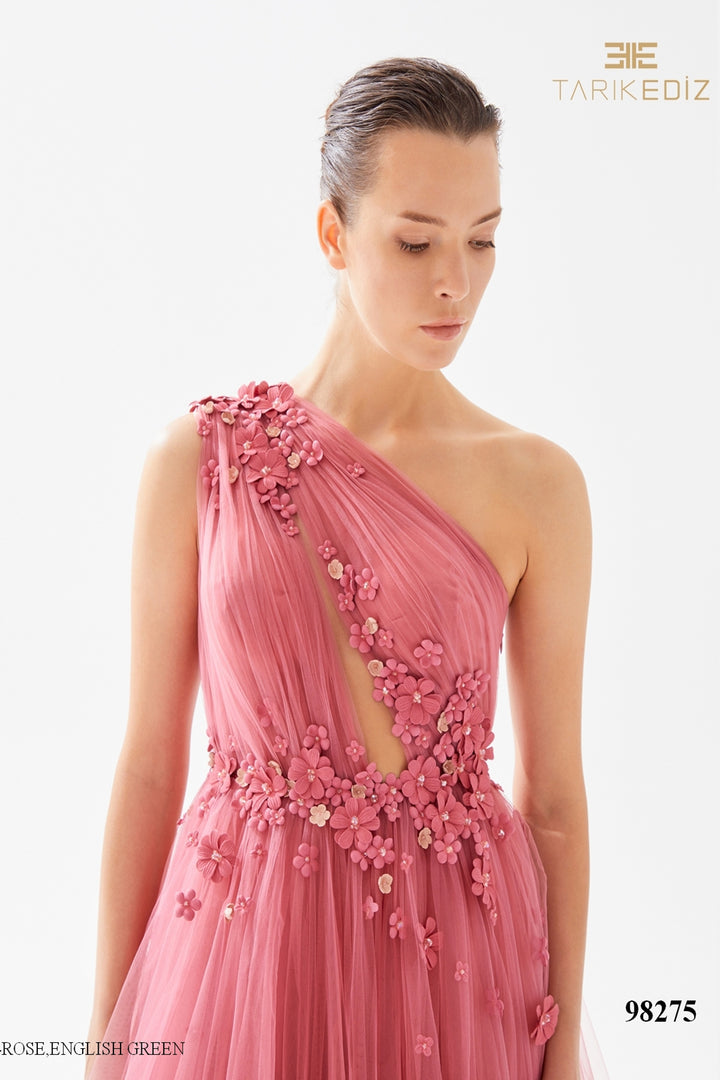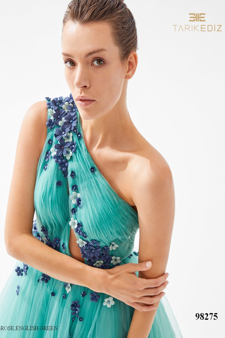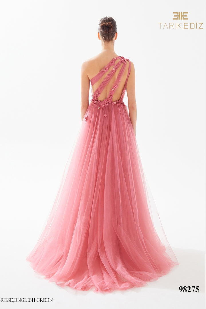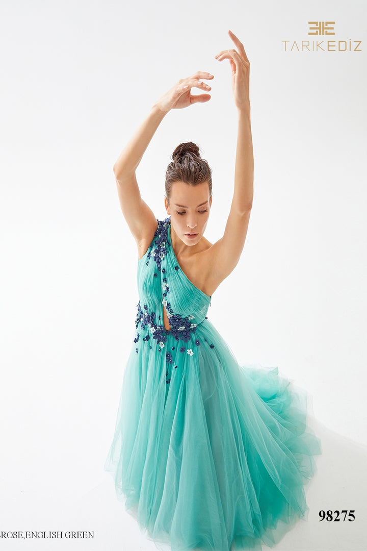 Adéntrate en un reino de elegancia refinada con el Tarik Ediz 98275, un largo vestido de noche de línea A que transforma tu presencia en una declaración inolvidable. Confeccionado en tul etéreo, este vestido presenta plisados delicados que contornean suavemente tu silueta, adornados con exquisitos adornos florales que evocan una sensación de romance atemporal. El escote de un hombro y la correa asimétrica revelan con gracia una espalda baja, fusionando el atractivo moderno con la sofisticación clásica. Diseñado para aquellos que aprecian la artesanía y el glamour, esta obra maestra sin mangas te invita a dominar la habitación con una postura seductora pero elegante, encarnando el espíritu del verdadero lujo.