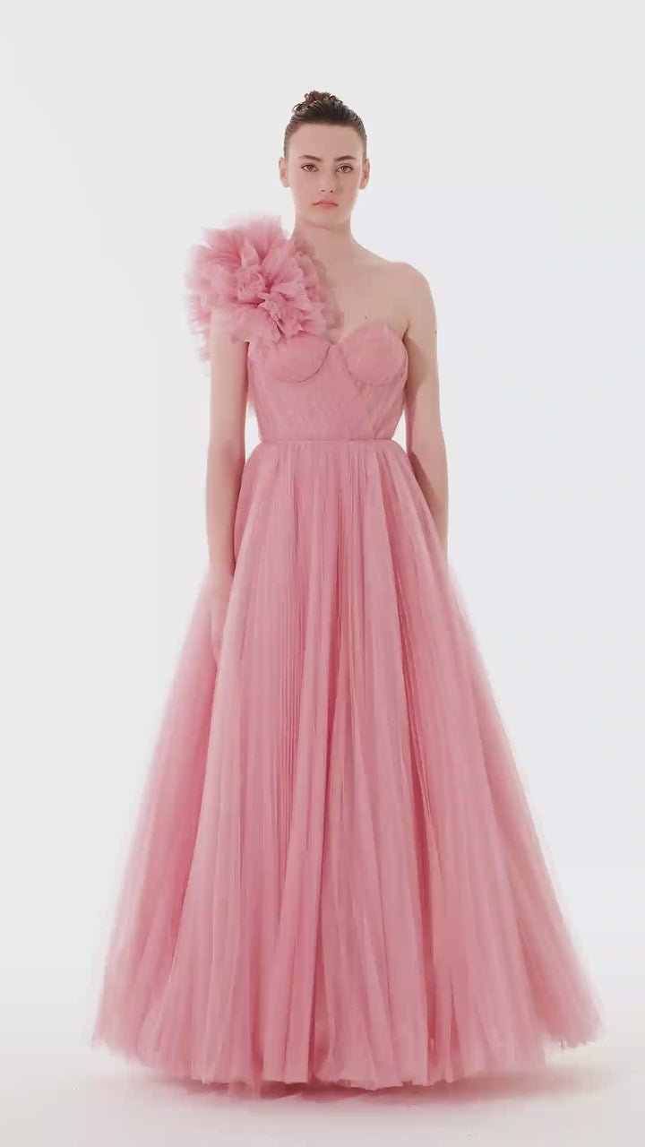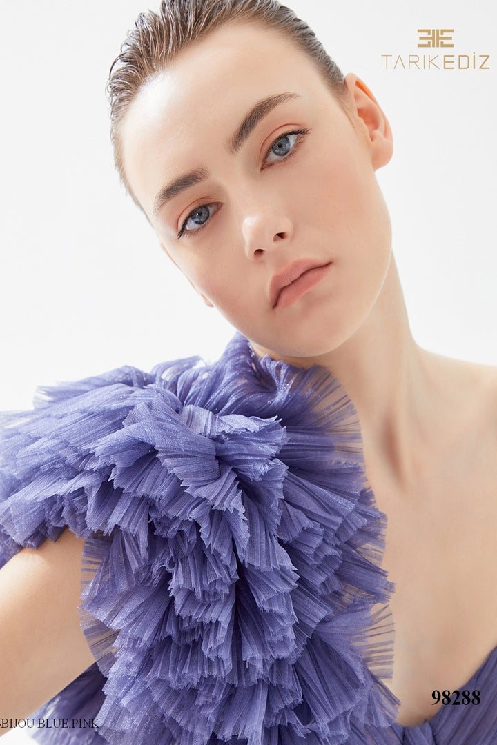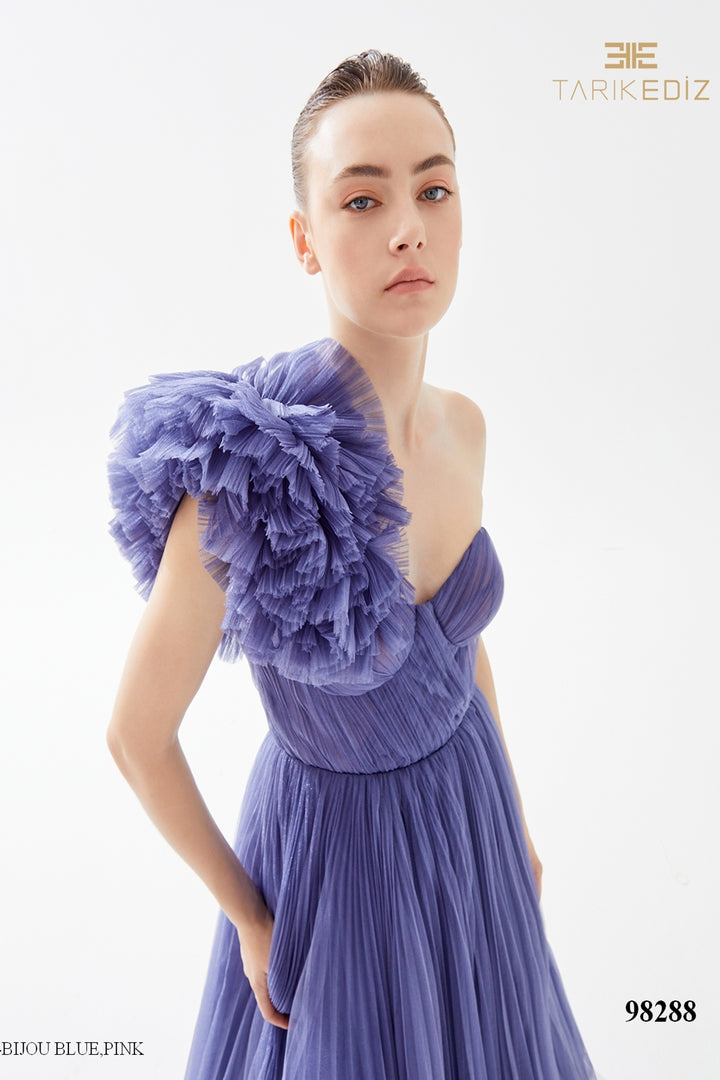 Pise el escenario con el Tarik Ediz 98288, un impresionante vestido de noche diseñado para momentos inolvidables. Este lujoso vestido de tul de princesa cautiva con su elegante escote de un hombro, adornado con delicados volantes e intrincados pliegues que evocan una sensación de romance refinado. El diseño sin mangas permite una postura sin esfuerzo, mientras que la espalda con cordones de corsé contornea su silueta, ofreciendo un ajuste personalizado que realza su elegancia natural. Fluyendo con una finura en capas, este vestido largo se mueve con una fluidez fascinante que llama la atención en galas, bodas o cualquier ocasión donde la sofisticación reina suprema. Experimente la exquisita artesanía y el atractivo atemporal que solo Tarik Ediz puede ofrecer.