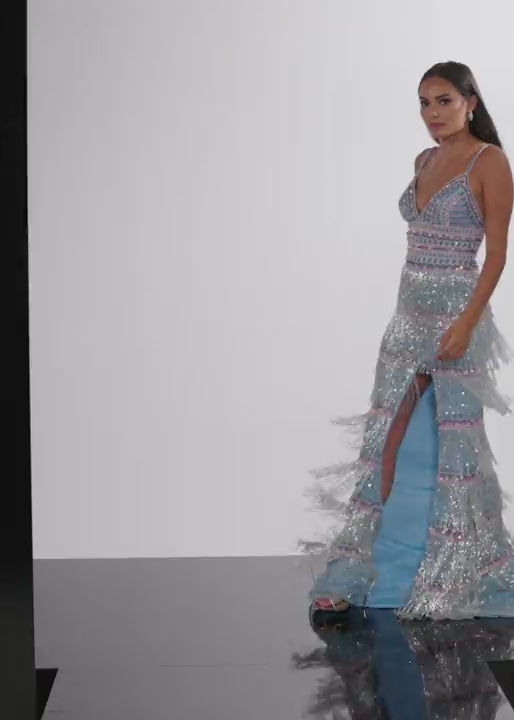 Pise en el centro de atención con el Jovani 38846, una mezcla magistral de atracción y refinamiento diseñada para noches inolvidables. Este vestido largo y ceñido está confeccionado con tela delicadamente adornada que brilla con cada movimiento, mientras que la abertura atrevida y los flecos sutiles añaden un toque dinámico a su silueta. El escote en V y las correas delgadas enmarcan graciosamente su escote, llevando a una llamativa espalda con cordones de corsé que asegura un ajuste impecable y personalizado. Ya sea captando la atención en una gala o haciendo una gran entrada en el baile de graduación, este vestido encarna el glamour sofisticado, elevando su estilo con elegancia sin esfuerzo y encanto atemporal.