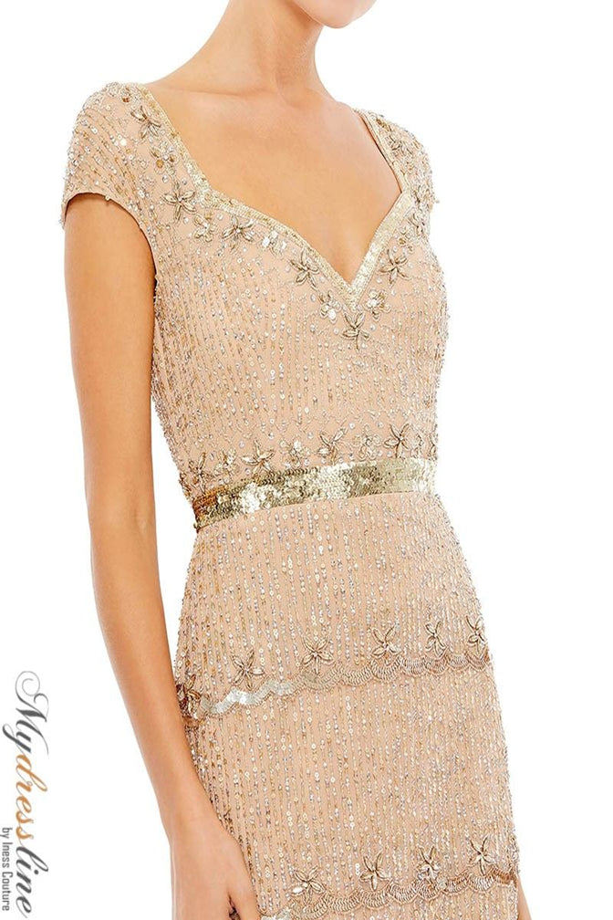 Sumérgete en la sofisticación refinada con el Mac Duggal 9089, un vestido de noche magistralmente diseñado para cautivar. Este largo y ajustado vestido de columna realza graciosamente tu silueta, su tela brillante de lentejuelas capturando la luz con cada movimiento. El delicado trabajo de cuentas a lo largo del escote en forma de corazón atrae artísticamente la atención hacia tus rasgos radiantes, mientras que las mangas cortas añaden un toque de elegancia clásica. El diseño de espalda baja con un cierre de cremallera discreto ofrece un acabado favorecedor y seductor. Ya sea asistiendo a un distinguido evento nocturno o celebrando como la madre de la novia, este vestido transforma tu presencia en una declaración de glamour atemporal y estilo impecable.