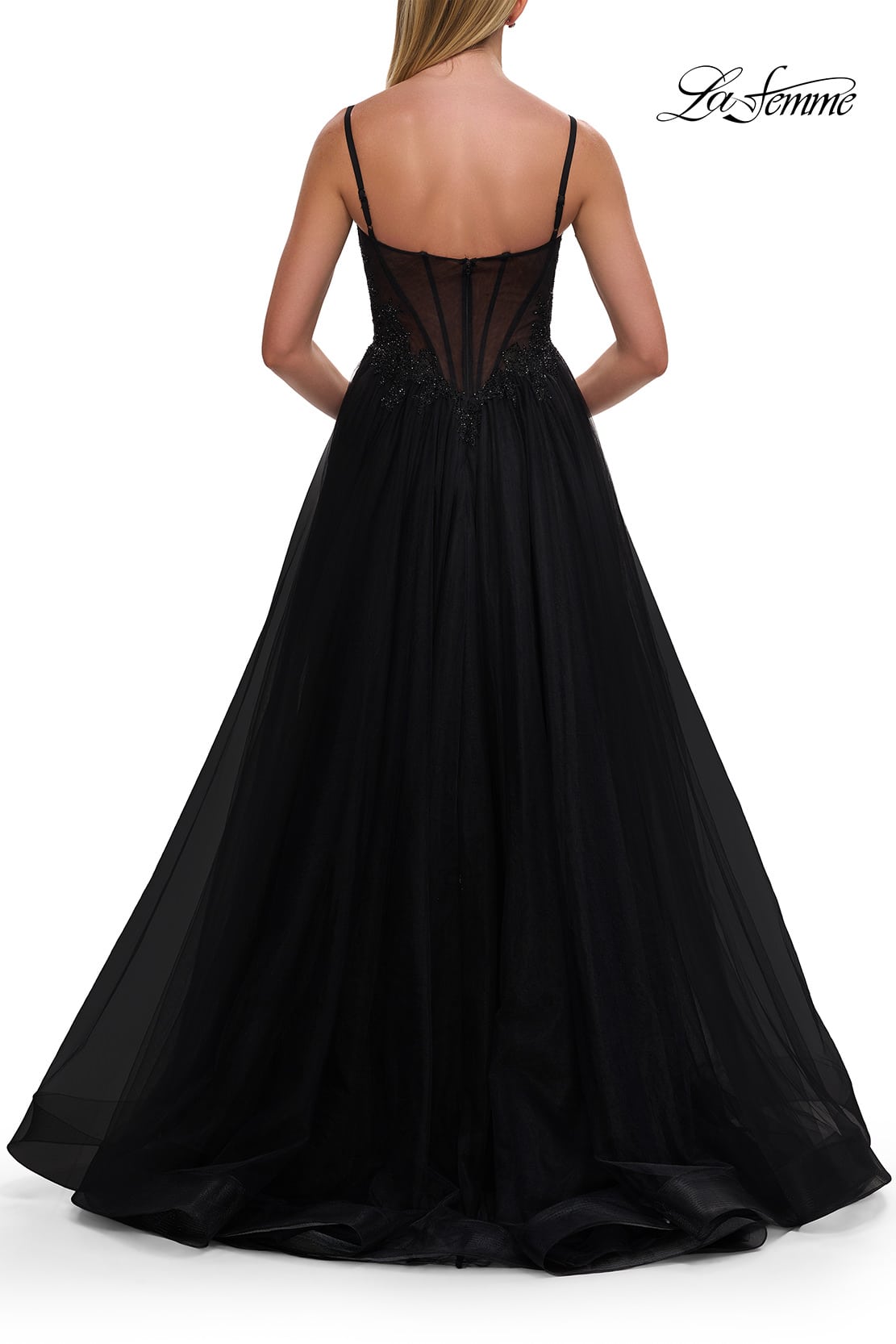 Adéntrese en un mundo de elegancia con La Femme 33436, un impresionante vestido largo que encarna sofisticación y encanto. Confeccionado con tul y seda lujosos, esta pieza destacada presenta un escote corazón y delicadas tiras finas que enmarcan hermosamente el escote. El corpiño, adornado con intrincados bordados de cuentas, brilla con cada movimiento, mientras la fluida silueta en línea A cae con gracia hasta una atrevida abertura lateral hasta el muslo, invitando a la admiración desde todos los ángulos. Perfecto para bailes de graduación, galas o cualquier ocasión formal, este vestido es una celebración de la artesanía refinada y el estilo atemporal, asegurando que deje una impresión duradera.