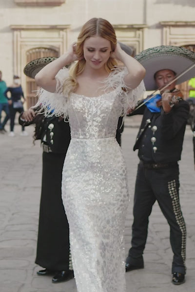 Eleve su noche con el Sherri Hill 55360, una mezcla magistral de diseño sofisticado y atracción romántica. Confeccionado con encaje exquisito y tela brillante de purpurina, este largo y ceñido vestido de columna abraza una silueta de hombros descubiertos que enmarca bellamente su escote. El detalle de escote festoneado realza la feminidad, mientras que la espalda con cordones de corsé ofrece un ajuste a medida que contornea su figura con precisión. Los acentos de plumas coronan delicadamente el vestido, otorgando un toque etéreo que la distingue en cualquier evento elegante o baile de graduación. Con la artesanía impecable de Sherri Hill, captará la atención y encarnará la elegancia sin esfuerzo.