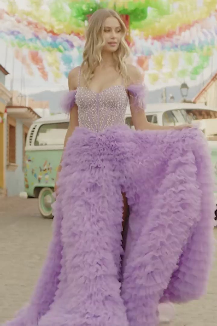 Pise el escenario con el Sherri Hill 55387, un impresionante vestido de noche diseñado para elevar su presencia en cualquier gran ocasión. Confeccionado con capas de tul etéreo y delicadamente adornado con deslumbrantes bordados, este largo vestido de gala estilo A-linea encarna una artesanía exquisita y un atractivo atemporal. El corsetado corsé, enmarcado por un escote corazón y elegantes tirantes fuera del hombro, esculpe una silueta fascinante que equilibra perfectamente la elegancia y la seducción. Una falda escalonada fluye sin esfuerzo hacia un dramático tren barrido, mientras una sugerente abertura frontal añade un toque moderno a esta obra maestra de la alta costura. Con una discreta cremallera en la espalda y detalles impecables, este vestido asegura que deslumbre con elegancia y glamour inolvidable en su velada.