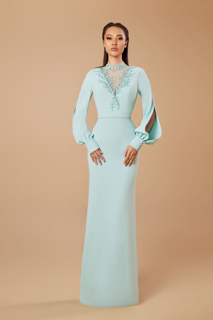 Eleve su presencia nocturna con el Sara Badr 1024 de la Colección de Noche Primavera 2025, una obra maestra creada para aquellos que imponen elegancia. Este lujoso vestido largo de columna de crepé moldea su silueta con su diseño ajustado, mientras que el cuello alto y las mangas largas ofrecen una allure refinada y elegante. Una abertura atrevida añade un toque sutil pero cautivador, permitiendo que el movimiento fluya sin esfuerzo mientras se desliza a través de cualquier evento. La discreta cremallera trasera garantiza un ajuste impecable, abrazando su forma con sofisticación. Diseñado para tallas grandes y ocasiones especiales como momentos de Madre de la Novia, este vestido transforma su noche en una declaración inolvidable de elegancia y lujo.