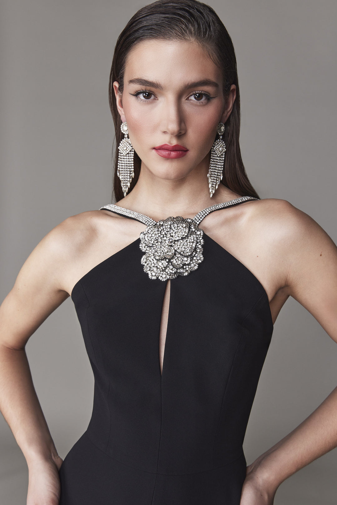 Sumérgete en la elegancia con el Frascara 4715, un magistral vestido de noche diseñado para elevar tu presencia sin esfuerzo. Confeccionado en crepúsculo suntuoso, este vestido de columna ajustado y sin mangas contornea tu silueta con gracia refinada, mientras que su escote halter y las correas de hombro adornadas con flores de cristal añaden un toque de sofisticación radiante. La abertura central en el corpiño y la atrevida abertura frontal en la falda crean un movimiento seductor que baila con cada paso, realzado por la cremallera trasera sutilmente oculta para un acabado impecable. Forrado en satén para mayor comodidad, este vestido largo encarna una mezcla impecable de lujo y feminidad audaz, perfecto para momentos que exigen un glamour innegable.