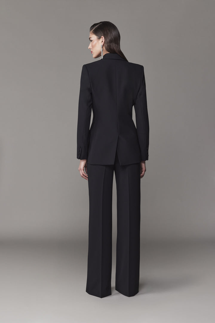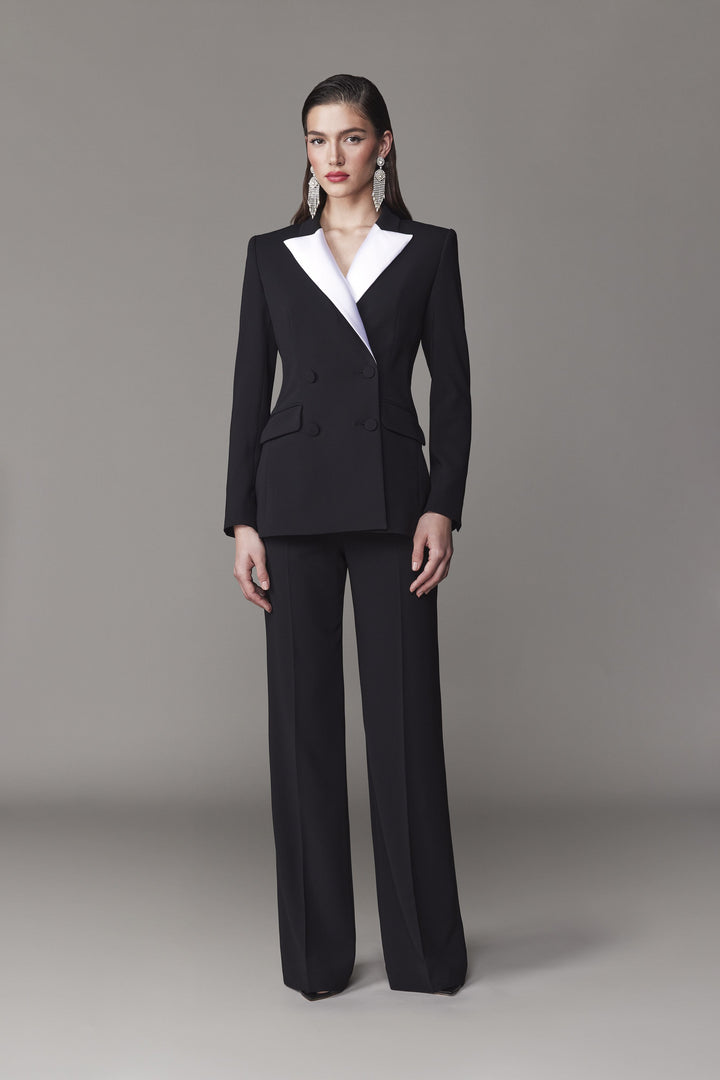Sumérgete en la elegancia refinada con el Frascara 4720, un lujoso traje de noche diseñado para elevar tu guardarropa sofisticado. Confeccionado en crepé suave, este mono a medida presenta un elegante corpiño halter adornado con delicados detalles de volantes, complementado por un cuello estructurado y mangas largas para un acabado pulido. Los pantalones de pierna ancha fluyen sin esfuerzo, creando una silueta elegante que llama la atención en cada evento. Los botones acentúan discretamente la pieza, mientras que la cremallera oculta en la espalda garantiza un ajuste impecable. El forro de satén acaricia tu piel, haciendo que la comodidad y el estilo sean compañeros inseparables mientras abrazas la noche con un estilo impecable.