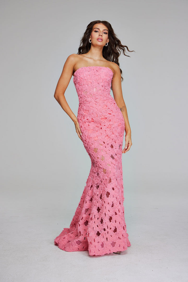 Sumérgete en la elegancia atemporal con el Jovani 40744, un lujoso vestido de noche diseñado para momentos inolvidables. Este vestido ajustado de estilo sirena esculpe graciosamente tu silueta, realzado por una delicada tela de encaje que irradia sofisticación. El escote cuadrado sin tirantes enmarca tu escote con refinada atracción, mientras que la elegante cremallera en la espalda garantiza un ajuste impecable. Un largo tren añade un toque dramático, perfecto para llamar la atención en cualquier gala o celebración especial. Diseñado para halagar y empoderar, este largo vestido de encaje combina encanto clásico con glamour moderno, invitándote a abrazar la noche con un estilo y confianza incomparables.