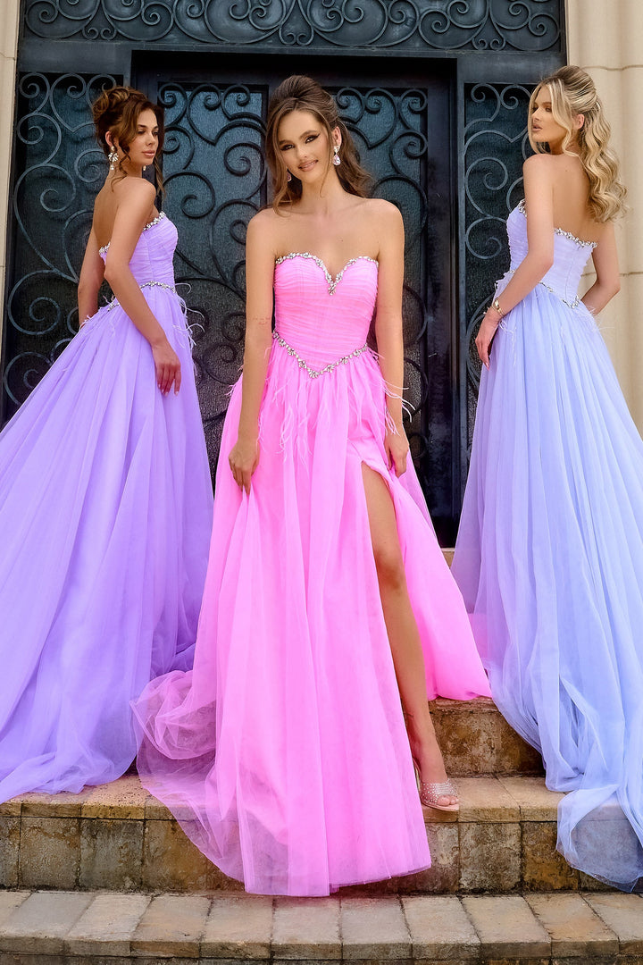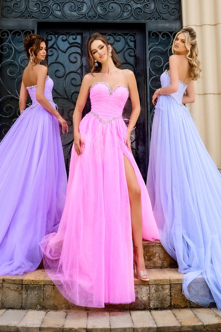 Pise el escenario con el Portia & Scarlett PS24632, un impresionante vestido de noche que eleva su presencia con sofisticación sin esfuerzo. Confeccionado en tul etéreo, esta obra maestra de línea A sin tirantes presenta un escote corazón que enmarca delicadamente su escote, mientras una elegante abertura y una cola fluida crean un movimiento tan cautivador como cada uno de sus pasos. Los detalles de plumas añaden un toque inesperado de fantasía y textura, invitando a una admiración suave. Diseñado con una elegante cremallera en la espalda para un ajuste impecable, este vestido largo promete comodidad y elegancia para sus ocasiones más memorables. Experimente la armonía perfecta entre romance y glamour moderno que hace que este vestido sea verdaderamente inolvidable.