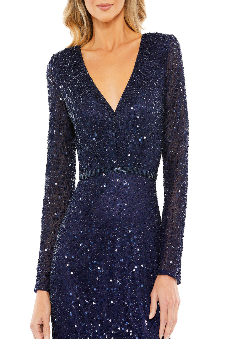 Experimente el atractivo de la elegancia refinada con el vestido de coctel Mac Duggal 5589. Esta obra maestra ajustada y acampanada, elaborada en tela de lentejuelas brillantes, contornea sin esfuerzo su silueta mientras que los intrincados bordados añaden un toque de exquisita artesanía. El favorecedor escote en V y las elegantes mangas largas enmarcan su figura con sofisticación, invitando miradas admirativas desde cada ángulo. Diseñado para la comodidad y la facilidad, la discreta cremallera trasera garantiza un ajuste impecable mientras se desplaza con confianza por su velada. Eleve su guardarropa con este vestido midi que encarna el lujo, haciendo de cada momento una celebración deslumbrante de su estilo impecable.