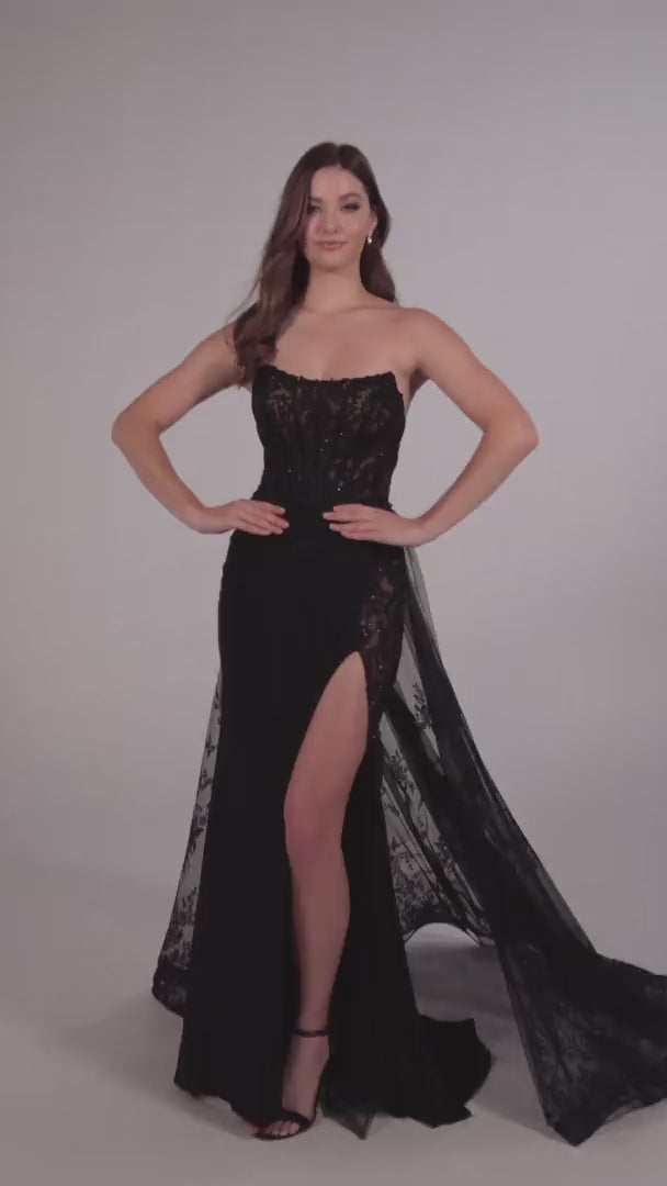 Pise el escenario con el Ellie Wilde EW35032, un vestido de noche largo diseñado para elevar sus ocasiones más memorables. Confeccionado en encaje delicado y lycra lustrosa, esta silueta de columna ajustada abraza su figura con un corpiño de corsé que deslumbra en encaje brillante y sutiles acentos de piedra. El escote palabra de honor complementa el atractivo romántico del corsé con cordones en la espalda, mientras que una abertura alta y una sobrefalda desmontable añaden movimiento dinámico y drama mientras se desliza por la noche. Ya sea en una gala o en el baile de graduación, esta obra maestra acentuada con cola le permite personalizar su elegancia, asegurando que todas las miradas se dirijan irresistiblemente hacia usted.