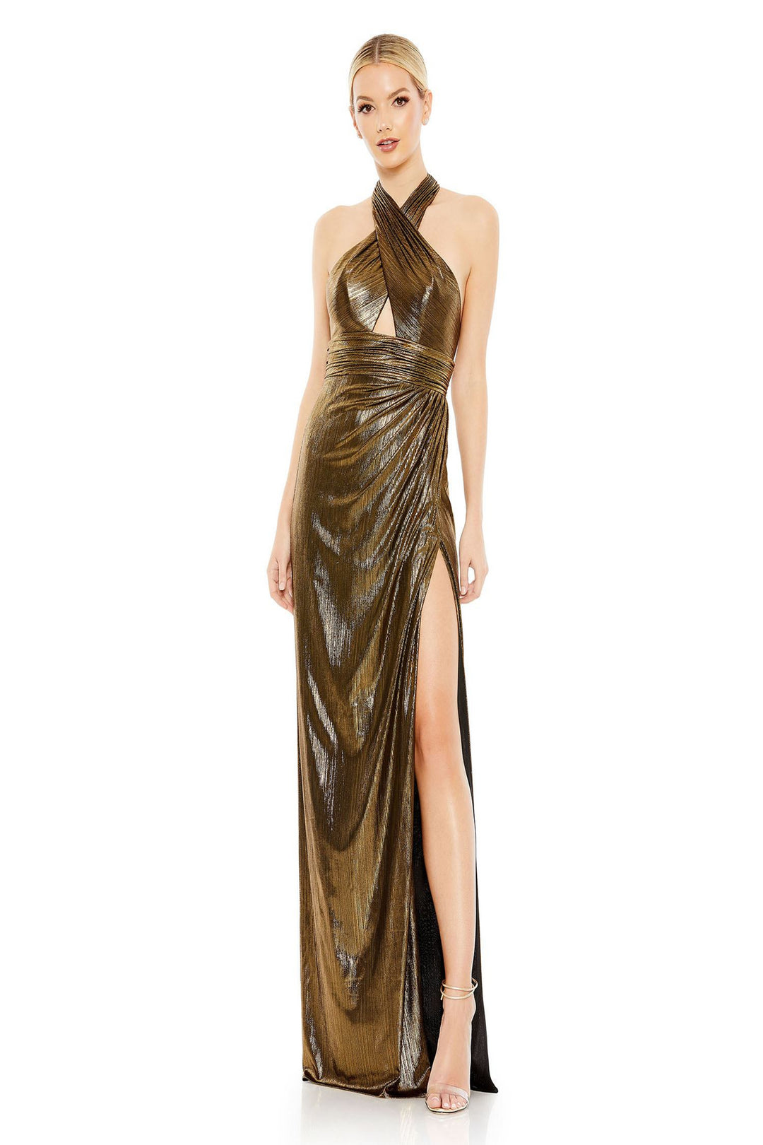 Sumérgete en una aura de sofisticación reluciente con el vestido de noche Mac Duggal 26738. Confeccionado en un radiante tejido metálico, este vestido ajustado contornea graciosamente tu silueta, mientras una discreta abertura añade un susurro de atracción a cada paso. El elegante escote halter enmarca bellamente tus hombros, complementado por una atrevida espalda baja que irradia glamour seguro. Los detalles drapeados realzan la fluidez de la falda larga, creando un movimiento fascinante que captura la luz y la atención. Ideal para noches inolvidables, esta obra maestra sin mangas de Mac Duggal te invita a encarnar la elegancia y convertir cada mirada en admiración.