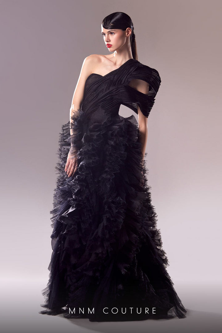 Pise en el centro de atención con el MNM Couture G1600, una mezcla magistral de arte y lujo diseñada para veladas inolvidables. Esta larga silueta en forma de A, confeccionada en delicado tul, le abraza delicadamente con texturas fruncidas y elegantes volantes que caen sin esfuerzo, mientras una atrevida abertura añade un toque de atractivo moderno. El escote de un solo hombro y la manga única crean un llamativo equilibrio asimétrico, resaltando su compostura y confianza. Diseñado para ocasiones de alta costura y momentos de madre de la novia, la discreta cremallera en la espalda garantiza un ajuste impecable. Experimente la elegancia refinada y el detalle suntuoso que definen la colección Otoño 2023 de MNM Couture, elevando su estilo a un nivel sin igual.