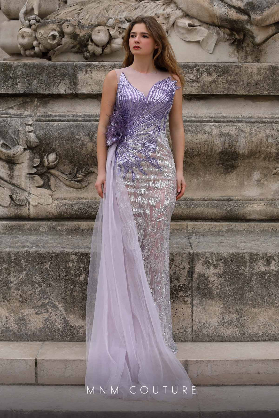Pise el escenario con el MNM Couture K4056, una creacion magistral disenada para elevar su presencia en cada evento de alta costura o noche especial. Este vestido largo entallado, adornado con lentejuelas brillantes y sutil brillo, contornea su silueta mientras ofrece una atractiva abertura lateral y delicados adornos florales que crean una danza artistica de luz con cada movimiento. El escote ilusion agrega un toque de misticismo, fusionando sin problemas sofisticacion con encanto moderno, mientras que el diseno sin mangas muestra una gracia elegante. Elaborado con una atencion impecable al detalle, la cremallera oculta garantiza un ajuste impecable, haciendola sentir radiante y memorable sin esfuerzo.