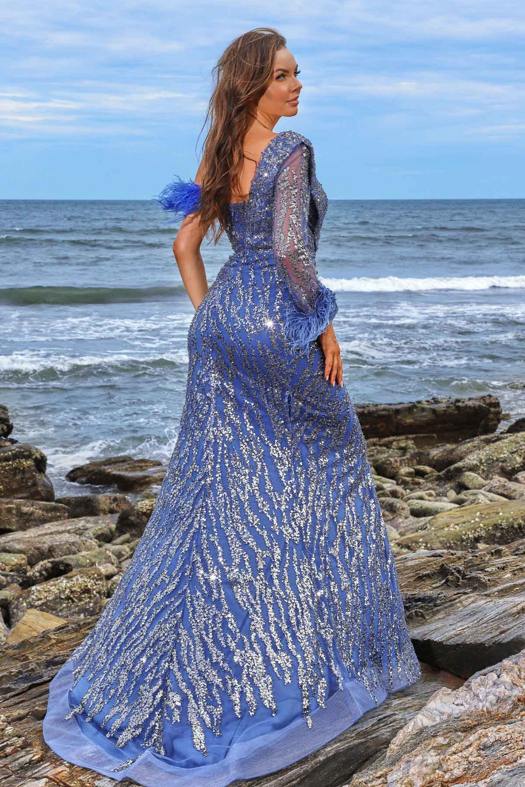 Sumérgete en el glamour refinado con el MNM Couture M1057, un impresionante vestido de noche diseñado para cautivar en cualquier evento prestigioso. Elaborado con lentejuelas brillantes, este vestido ajustado contornea graciosamente tu silueta, acentuado por un favorecedor escote corazón y mangas fuera del hombro que evocan feminidad atemporal. La atrevida abertura combinada con delicados detalles de plumas y un corsé estructurado crea una encantadora mezcla de audacia y elegancia. Ya sea que seas la madre de la novia o asistas a una exclusiva velada, el diseño largo y fluido y la discreta cremallera en la espalda garantizan un ajuste impecable. Acepta la sofisticación y deja que esta obra maestra eleve tu presencia sin esfuerzo.