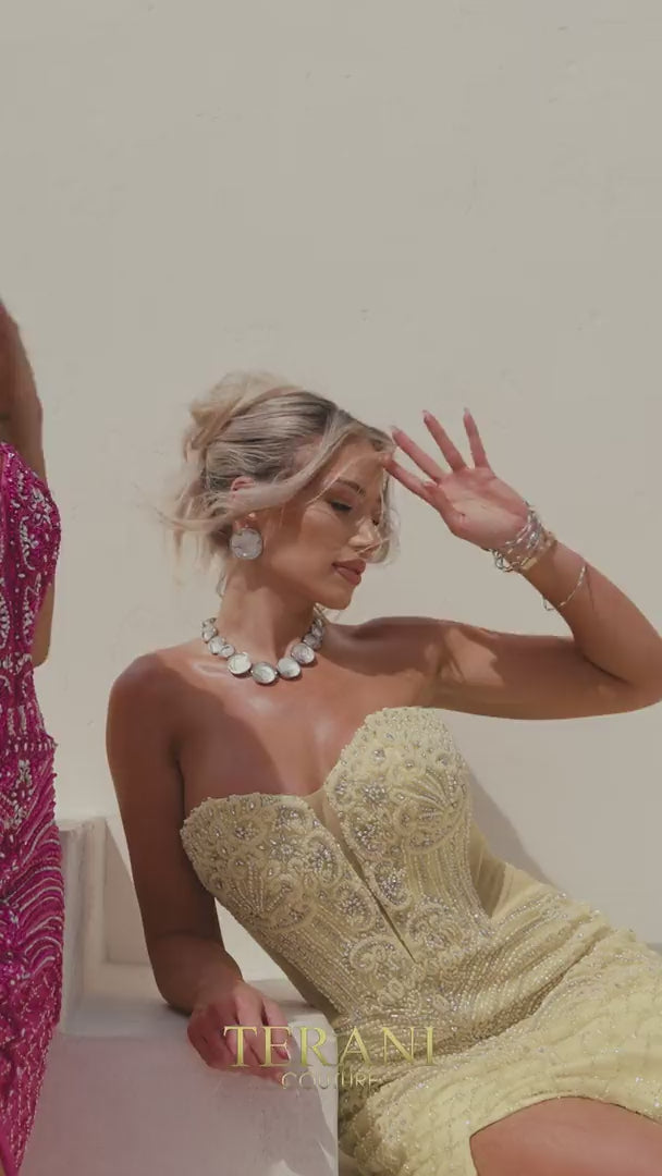 Sumérgete en la elegancia con el Terani Couture 241P2208, un impresionante vestido de noche largo diseñado para elevar tu presencia en cualquier evento de lujo. Confeccionado con exquisita tela adornada, este ajustado vestido de columna contornea graciosamente tu silueta, realzando tus curvas naturales con un atractivo refinado y sensual. El escote corazón sin tirantes enmarca bellamente tu escote, mientras que la sutil abertura y la cola fluida añaden un aire de sofisticación dramática a medida que te mueves. Con una discreta cremallera en la espalda que garantiza un ajuste impecable, este vestido encarna el lujo y la confianza, perfecto para noches inolvidables donde eres el centro de atención. Disfruta de una obra maestra que celebra tu glamour y compostura.