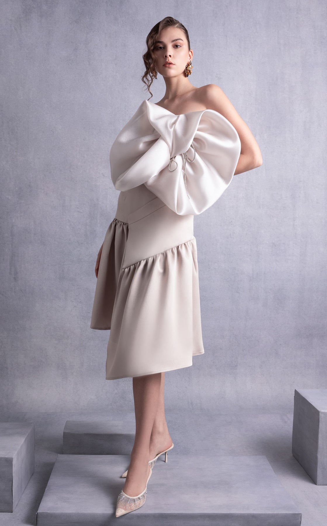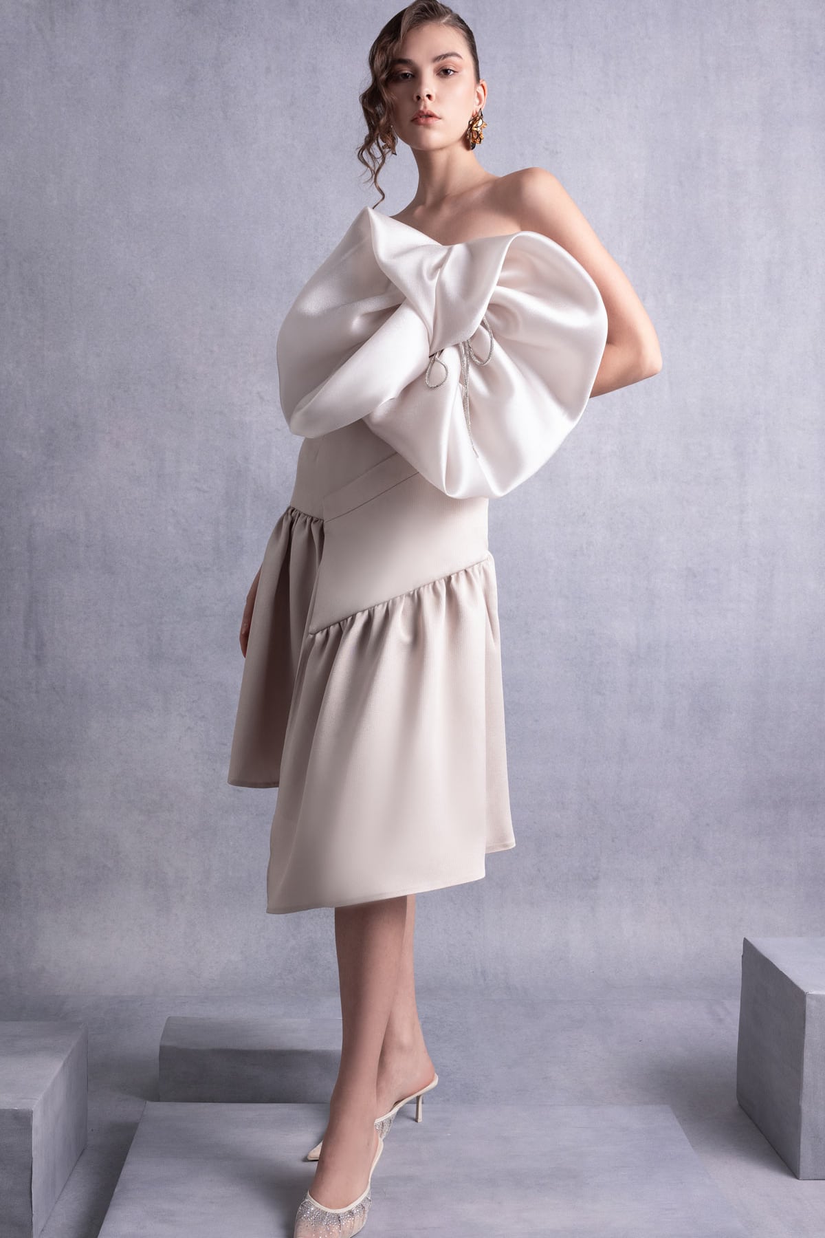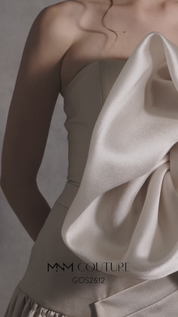 Présentation de la robe de soirée MNM Couture GOS2512, une sublime création qui incarne l'essence de l'élégance et de la sophistication. Confectionnée en satin luxueux et organza aérien, cette pièce maîtresse arbore un magnifique design asymétrique à une épaule orné d'un nœud spectaculaire, créant une silhouette saisissante qui capte le regard. La coupe évasée longueur genou met gracieusement en valeur votre silhouette, tandis que les fronces délicates ajoutent une touche de raffinement. Parfaite pour les cocktails ou les occasions formelles, cette robe promet de faire de vous le centre de l'attention, dégageant confiance et glamour à chaque pas.