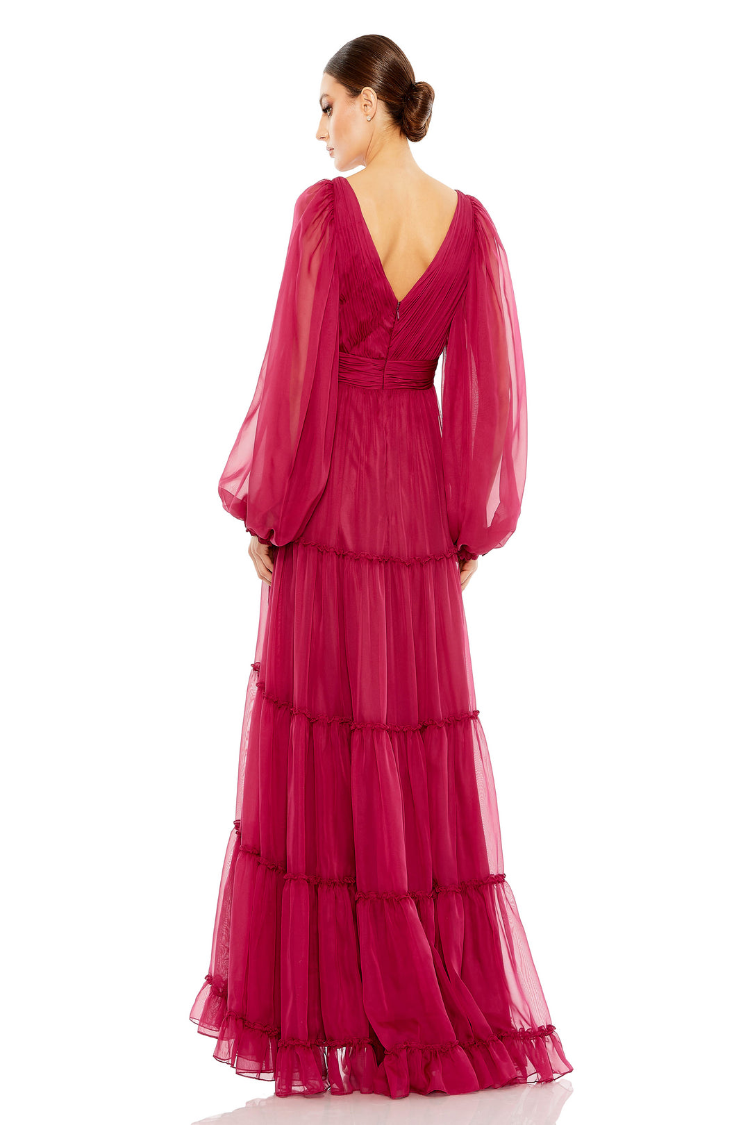 Plongez dans une élégance inoubliable avec la robe de soirée en mousseline Mac Duggal 68198, conçue pour captiver à chaque regard. Le décolleté en V gracieux et les longues manches fluides évoquent une sophistication romantique, tandis que les volants à plusieurs niveaux cascades le long de la silhouette en A, créant un mouvement enchanteur sous tous les angles. Conçu pour ces soirées spéciales et les moments de mère de la mariée, sa conception longue jusqu'au sol se drapent sans effort, vous enveloppant dans un luxe raffiné. La fermeture éclair discrète à l'arrière assure un ajustement parfait et sans couture qui complète votre silhouette avec facilité. Cette robe transforme les occasions formelles en souvenirs intemporels, vous faisant vous sentir aussi radieuse que le moment lui-même.