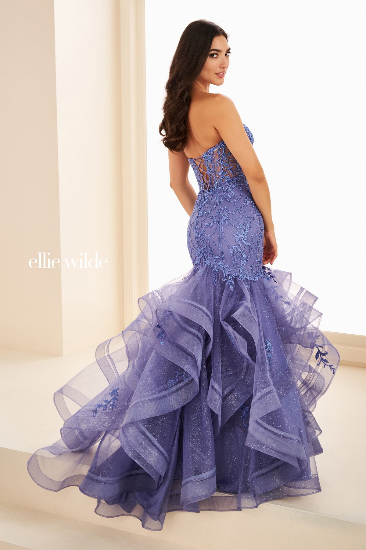 Robedebalpromprintemps2026EllieWildeEW37113enTullebrodé,Appliquédelaçé,Accentsdepierres,Tulleglitter.