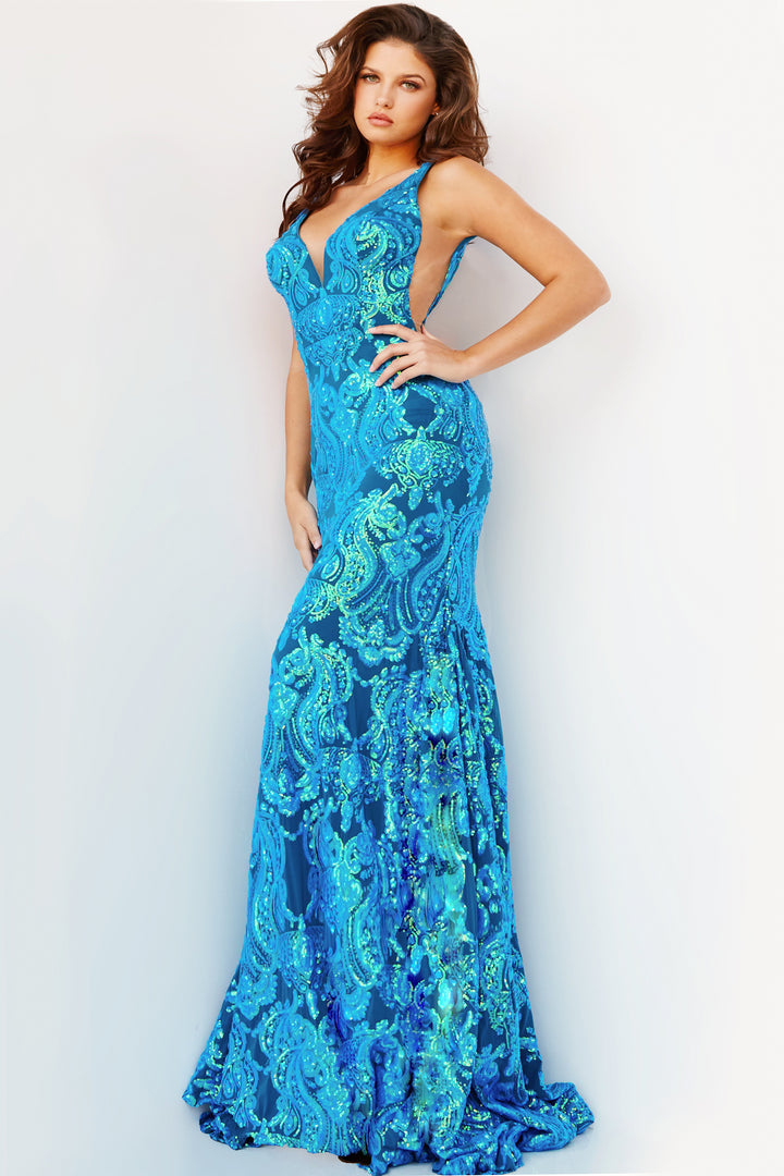 Faites une entrée remarquée avec la robe sirène Jovani 08646, une création magistrale qui incarne un glamour raffiné. Son tissu pailleté scintillant cascade sans effort le long de votre silhouette, mettant en valeur le design ajusté et accentuant vos courbes avec une sophistication inégalée. Le décolleté plongeant invite une touche d'élégance audacieuse, tandis que la traîne fluide ajoute une finition dramatique mais gracieuse, parfaite pour des soirées inoubliables. Conçue pour celles qui attirent l'attention lors des bals de promo ou des événements sur tapis rouge, ce chef-d'œuvre sans manches allie texture luxueuse et détails exquis, vous assurant de rayonner de confiance et de séduction sous tous les angles. Adoptez un look qui transforme chaque instant en une déclaration de beauté intemporelle.