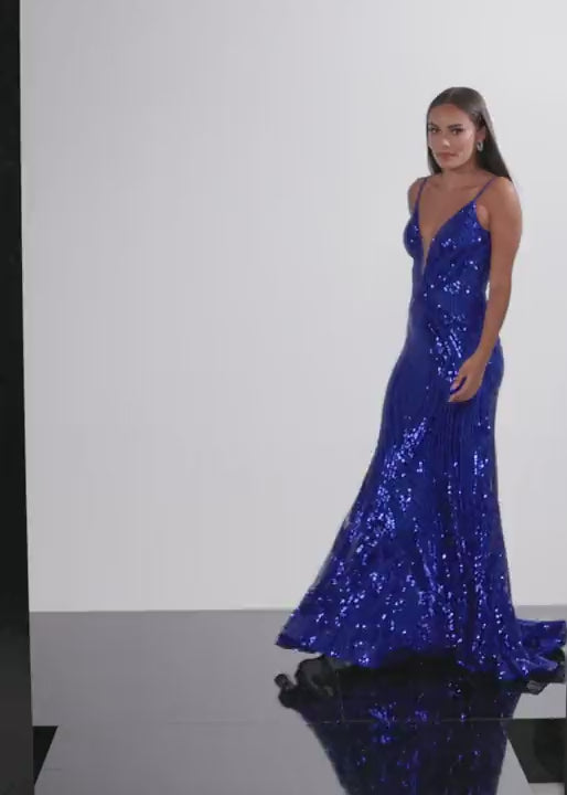 Plongez dans un monde de glamour raffiné avec la robe de soirée Jovani 09693, une création magistrale conçue pour captiver. Son tissu riche en sequins capte la lumière à chaque mouvement, créant un scintillement hypnotisant qui assure que vous êtes au centre de l'attention. La silhouette ajustée épouse gracieusement vos courbes, tandis que le décolleté plongeant ajoute une touche audacieuse mais élégante. Ressentez le drame se dérouler alors que la longue traîne balaye derrière vous, élevant votre présence avec une sophistication royale. Agrémentée de fines bretelles et d'une fermeture éclair basse dans le dos, cette robe allie allure moderne et prestance intemporelle, faisant de votre soirée spéciale un événement inoubliable.